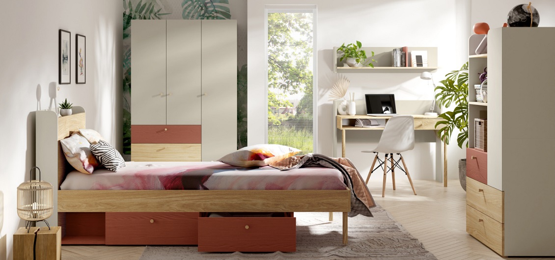 Kolekcja Yuki – modne meble młodzieżowe w wyjątkowym odcieniu koralu. Styl, wygoda i funkcjonalność w idealnej kolekcji do pokoju nastolatka.