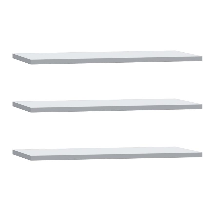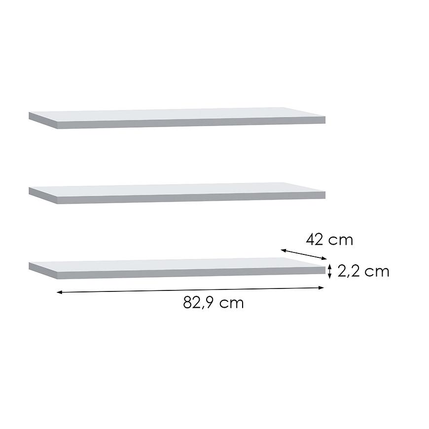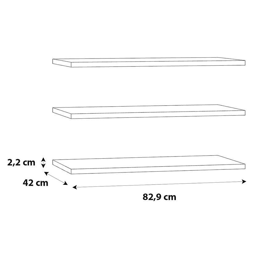 Komplet składa się z trzech półek o wymiarach 82,9 cm szerokości, 42 cm wysokości i 2,2 cm głębokości. Idealne wymiary półek pozwalają na optymalne wykorzystanie przestrzeni wewnątrz szafy. Półki są wykonane z trwałej i solidnej płyty wiórowej laminowanej, co gwarantuje ich wytrzymałość i długą żywotność. Kolor szary w matowym wykończeniu nadaje półkom nowoczesny i elegancki wygląd, doskonale dopasowując się do wnetrza szafy.