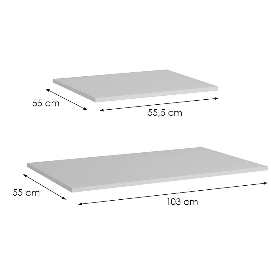 Półki do szafy Marbella/Alicante 150 (komplet 2 szt.) biały to praktyczne wyposażenie wnętrza garderoby, które pozwala maksymalnie wykorzystać przestrzeń przechowywania. Zestaw obejmuje dwie półki o wymiarach 55,5x55x3,5 cm oraz 103x55x3,5 cm, dzięki czemu bez problemu dopasujesz je do szafy o szerokości 150 cm. To idealne rozwiązanie dla osób, które chcą zwiększyć ilość miejsca na ubrania, pościel, pudełka czy akcesoria.