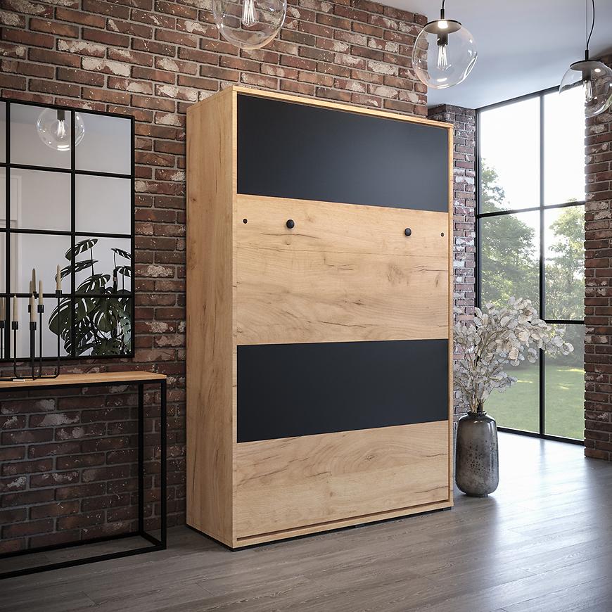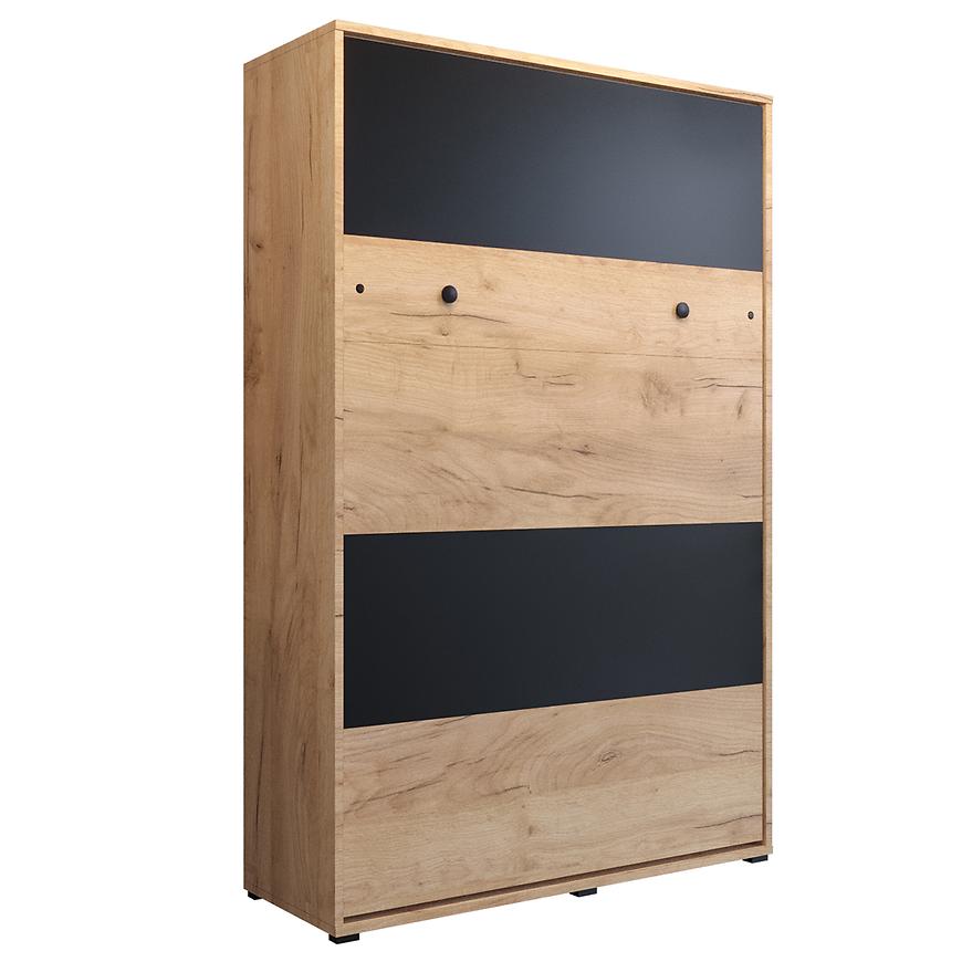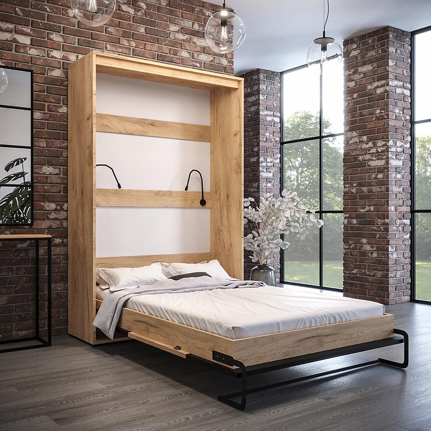 Konstrukcja łóżka obejmuje solidną płytę o grubości 22 mm dla korpusu i 16 mm dla paneli frontowych. Noga metalowa oraz rama stelaża ze sklejki gwarantują trwałość i stabilność. Mechanizm sprężynowy wspomagający otwieranie i zamykanie łóżka sprawia, że korzystanie z niego jest proste i wygodne.