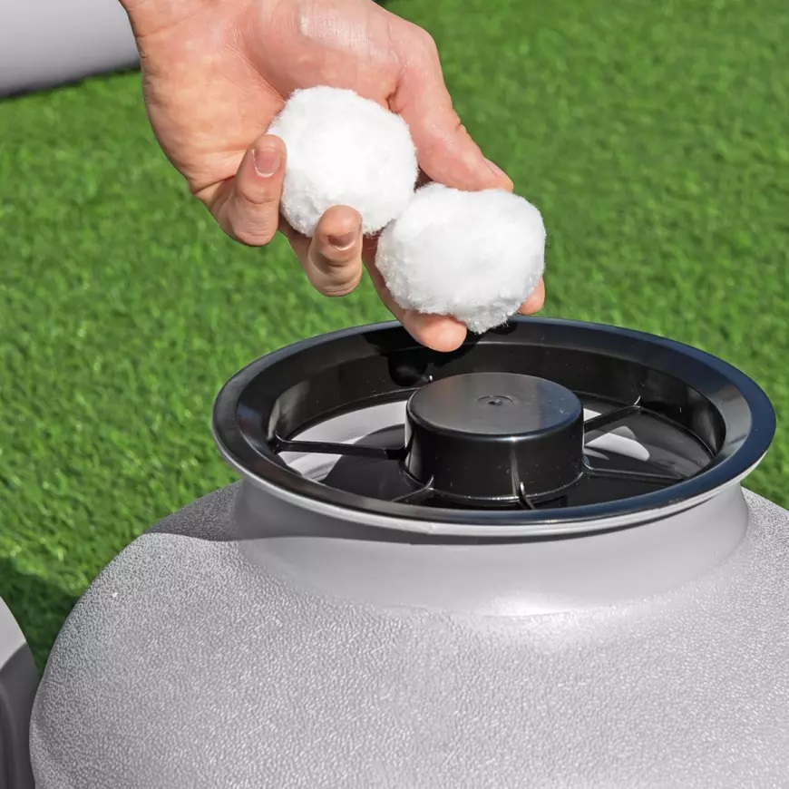- Obsługuje piasek kwarcowy (#20, 0,45–0,85 mm) lub kule filtracyjne Polysphere™ (około 9 kg/250 g).