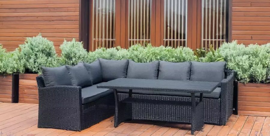 - Meble ogrodowe z technorattanu – odporne na warunki atmosferyczne, lekkie, stylowe i łatwe w utrzymaniu czystości. To świetna opcja na tarasy i duże balkony.