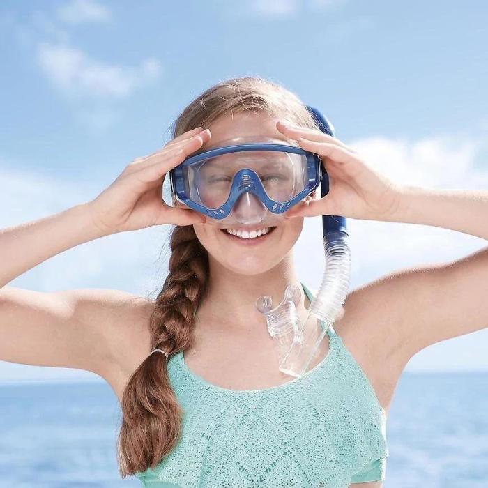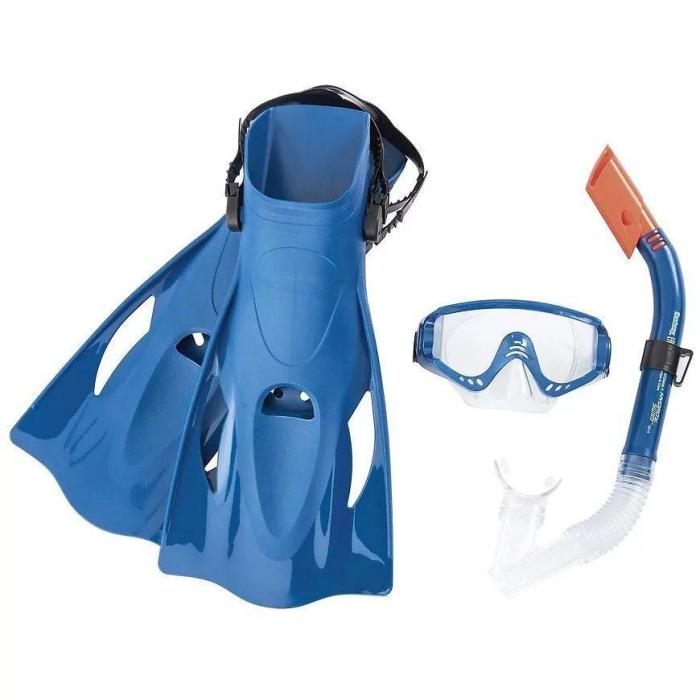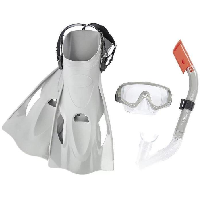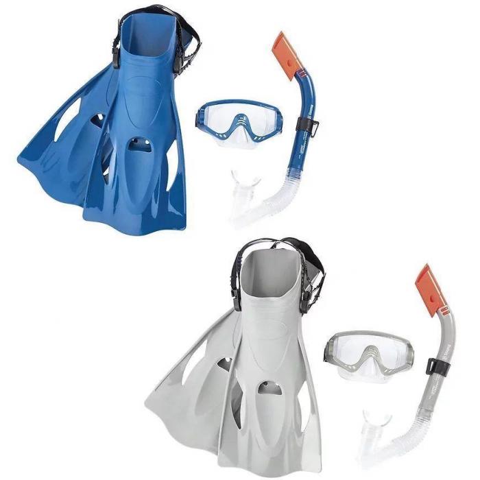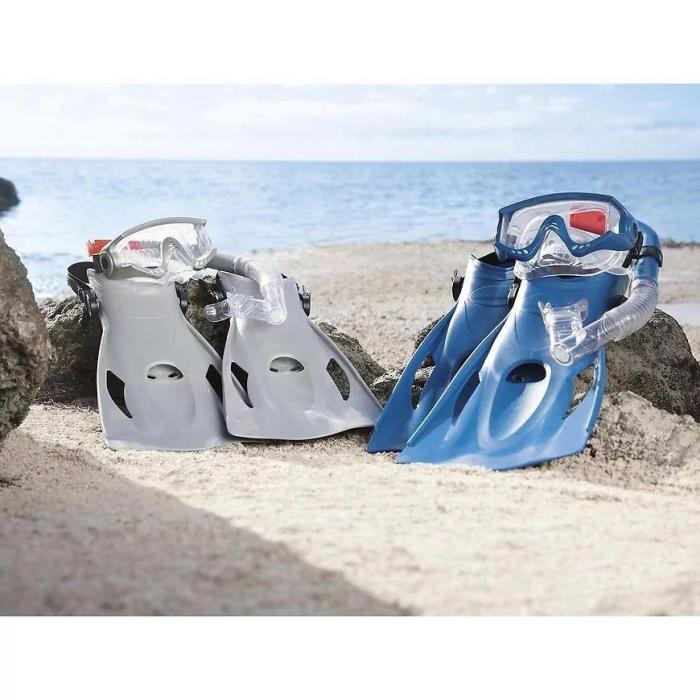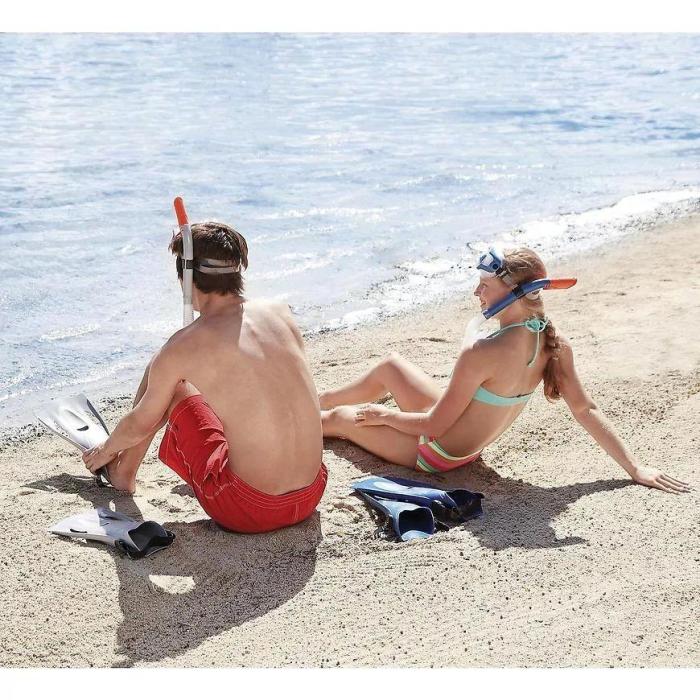 Zestaw do nurkowania maska, fajka i płetwy to świetny dodatek do zabawy w wodzie. Maska posiada bezpieczne soczewki z powłoką ochronną UV oraz pasek do regulacji obwodu głowy. Płetwy miękkie i sprawdzone pod względem komfortu o rozmiarach: US (8-12); EUR (41–46) z regulowanym paskiem na pięcie. 100% bez lateksu.