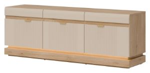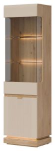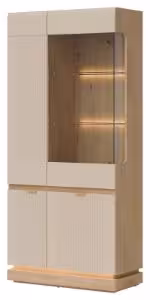 Opcjonalne oświetlenie LED, dostępne m.in. w przeszklonych witrynach, nie tylko eksponuje zawartość mebli, ale także tworzy nastrojową atmosferę, idealną do wieczornego relaksu. Dyskretne podświetlenie podkreśla nowoczesny charakter kolekcji i dodaje wnętrzom przytulności.