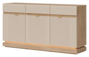 Na szczególną uwagę zasługują frezowane fronty, które przełamują gładkie powierzchnie i wprowadzają do wnętrza interesującą grę światła i cienia. To detal, który podkreśla nowoczesny styl kolekcji, a jednocześnie wprowadza do wnętrza element dekoracyjny bez nadmiaru ozdobników.