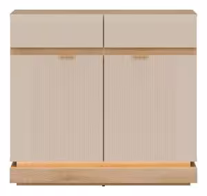 Fronty wykonane z matowej płyty MDF dostępne są w dwóch subtelnych wariantach kolorystycznych – eleganckim antracycie oraz ciepłym kaszmirze. Ich powierzchnię zdobią pionowe frezowania, które nadają meblom nowoczesny, a zarazem nieprzesadzony charakter. Złote uchwyty wprowadzają do wnętrza nutę luksusu i doskonale kontrastują z matowym wykończeniem, tworząc wyrazisty, ale spójny akcent dekoracyjny.