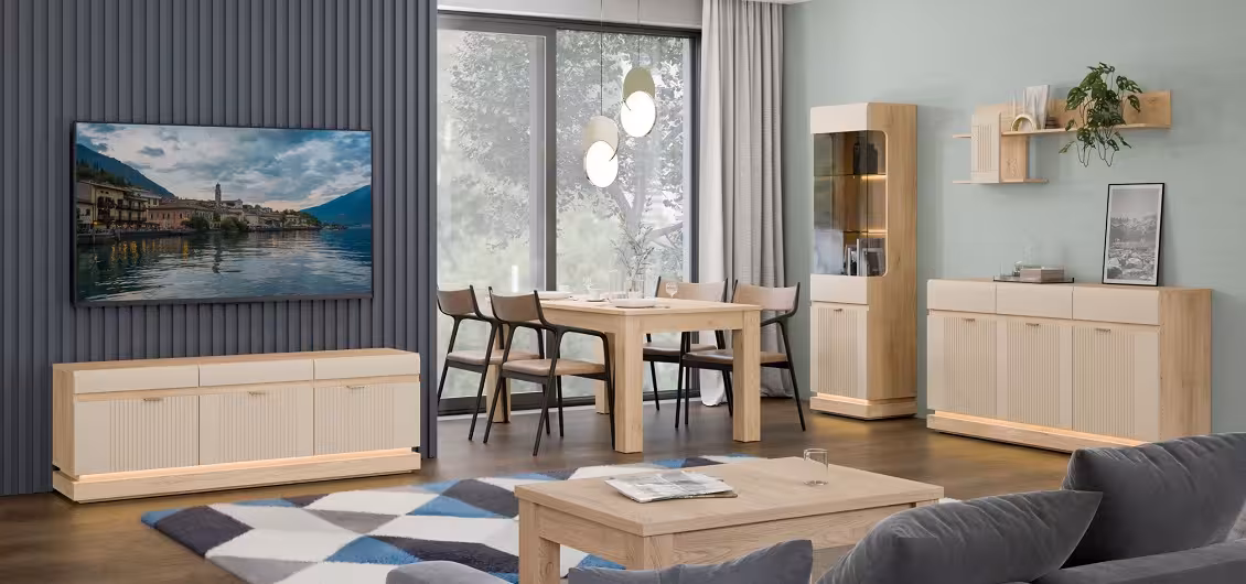 Kolekcja Milton to nowoczesne meble pokojowe, które harmonijnie łączą elegancję i funkcjonalność. To propozycja dla osób poszukujących rozwiązań do salonu i jadalni, które nie tylko zachwycają estetyką, ale również zapewniają codzienny komfort użytkowania. Precyzyjne wykończenie, przemyślane detale oraz możliwość rozszerzenia o oświetlenie LED sprawiają, że system Milton doskonale odnajdzie się w nowoczesnych i ponadczasowych aranżacjach wnętrz.
