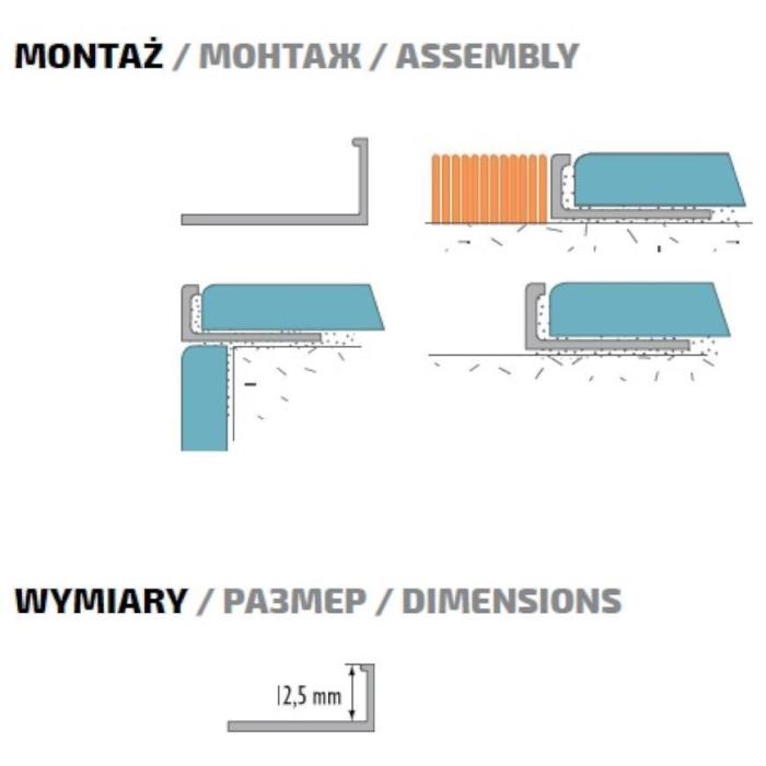 Listwa narożna L o długości 250 cm i szerokości 1,9 cm zabezpiecza krawędzie wyłożone płytkami ceramicznymi. Jest tez zakończeniem nawierzchni płytki w przypadku gdy styka się z innym rodzajem nawierzchni np. dywanem, wykładziną.