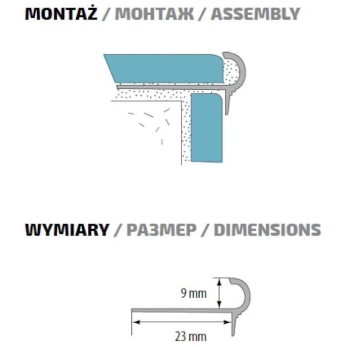 Profil służy do ochrony krawędzi stopni schodowych, wyłożonych płytkami ceramicznymi. Zabezpiecza przed poślizgiem.