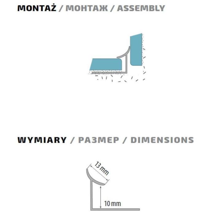 Przy poprawnym ułożeniu płytek profil ten może służyć jako osłona dylatacji. Zabezpiecza i maskuje wewnętrzne kąty połączeń płytek ceramicznych.