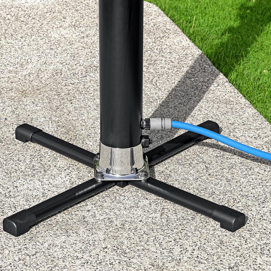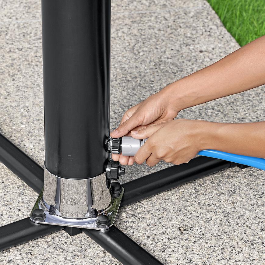 Montaż prysznica jest łatwy i dostosowany do różnych potrzeb. Przymocuj go do stojaka o wysokości 2,18 m (2 cale) i korzystaj z wygodnej podstawy o wymiarach 63 cm x 63 cm (25 cali x 25 cali) dla stabilności i swobody ruchu prysznica. Dodatkowo, możesz umieścić go bezpośrednio na tarasie lub patio, uzyskując dodatkowe wsparcie i swobodę przemieszczania.