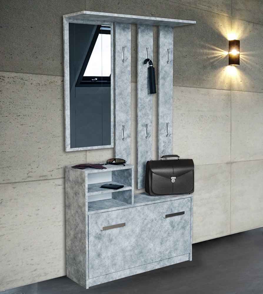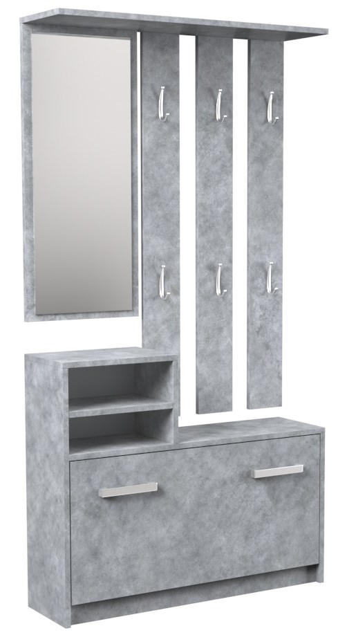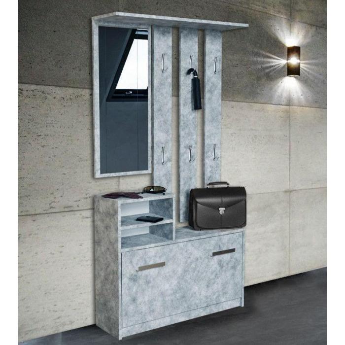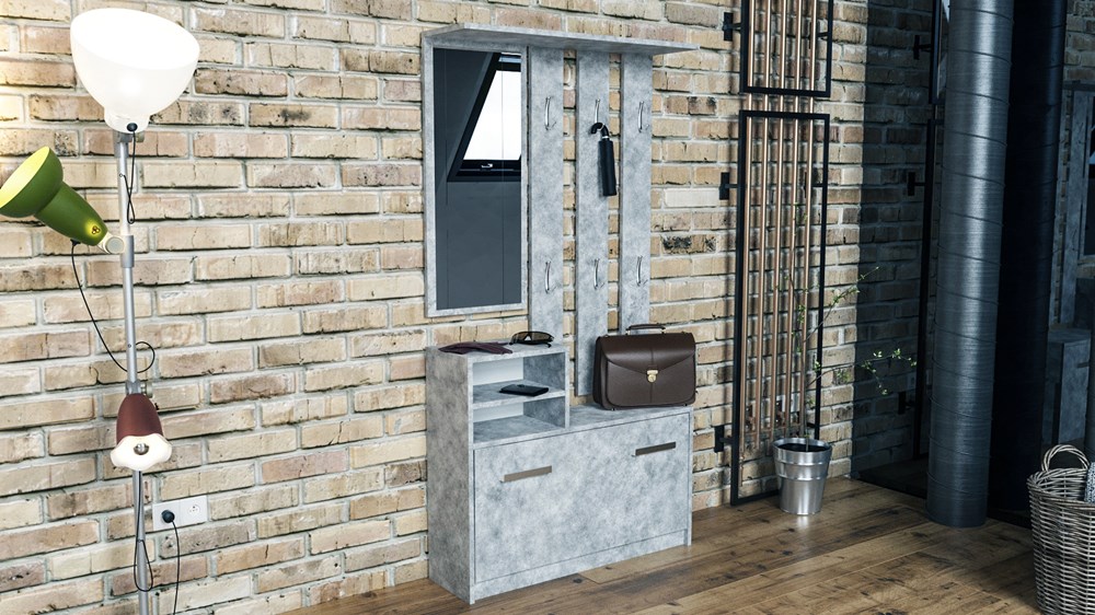 Przedpokój Ariel pozwoli szybko i wygodnie umeblować przedpokój. Na zestaw składa się moduł stojący, czyli zamykana szafka na buty, wyposażona w dwie pojemne półki, z dodatkowymi półeczkami na blacie, a także moduł wiszący – elegancki panel z sześcioma praktycznymi wieszakami oraz lustrem, pozwalającym skontrolować swój wygląd przed wyjściem z domu. Wszystko to zamknięto w wymiarach 85x24x160 cm. Przedpokój Ariel wykonany został z płyty laminowanej o grubości 16 mm. Zapewnia to jego wytrzymałość oraz solidność.