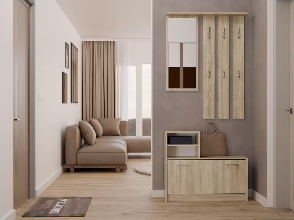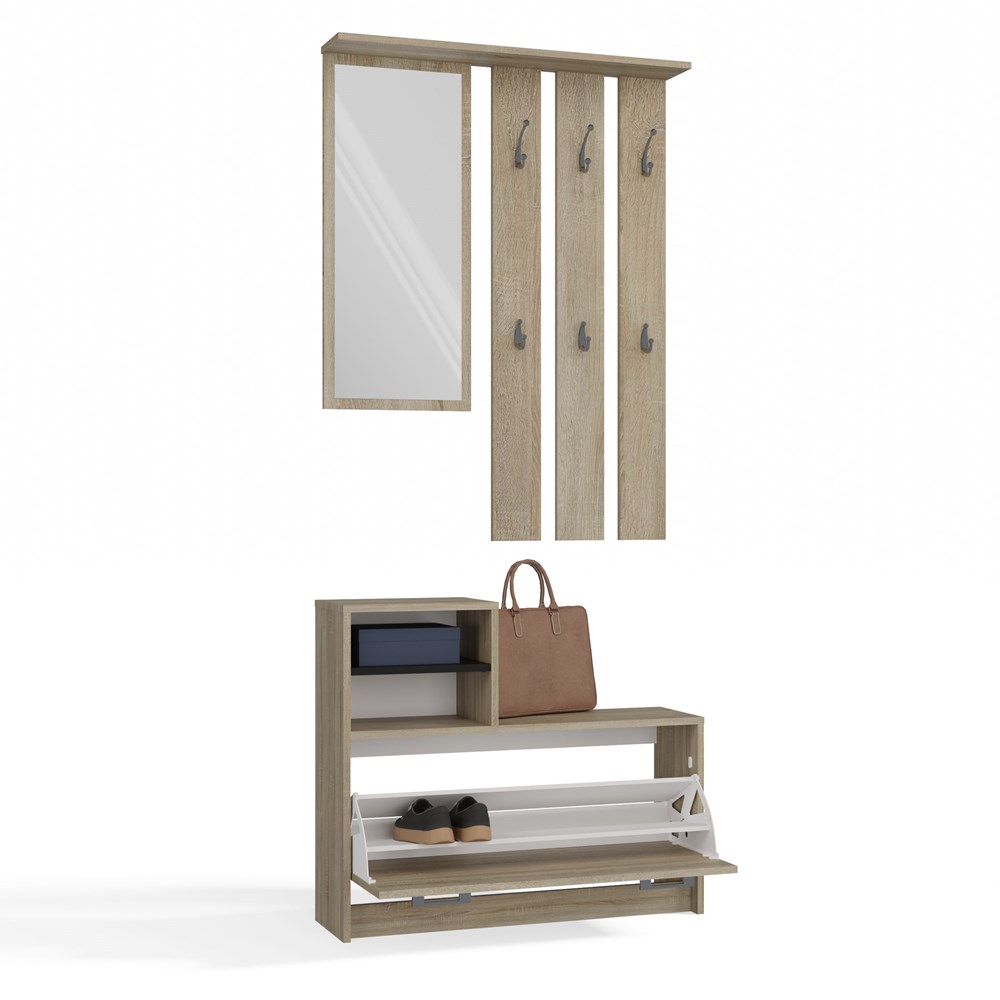 Przedpokój Ariel dąb sonoma pozwoli szybko i wygodnie umeblować przedpokój. Na zestaw składa się moduł stojący, czyli zamykana szafka na buty, wyposażona w dwie pojemne półki, z dodatkowymi półeczkami na blacie, a także moduł wiszący – elegancki panel z sześcioma praktycznymi wieszakami oraz lustrem, pozwalającym skontrolować swój wygląd przed wyjściem z domu. Wszystko to zamknięto w wymiarach 85x24x180 cm. Przedpokój Ariel wykonany został z płyty laminowanej o grubości 16 mm. Zapewnia to jego wytrzymałość oraz solidność. Piękny, naturalny odcień dębu sonoma sprawia natomiast, że przedpokój Ariel pasuje do mieszkań urządzonych w różnych stylach, komponując się z różnymi kolorami czy materiałami wykończeniowymi.