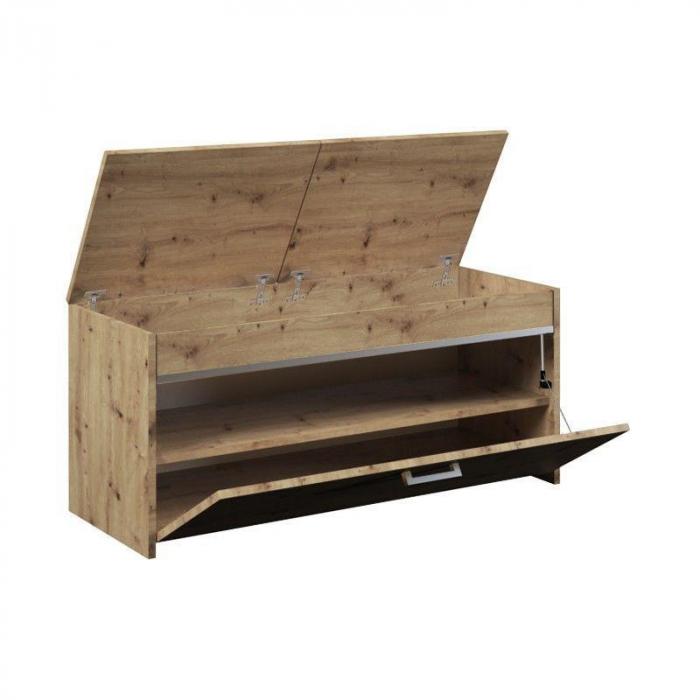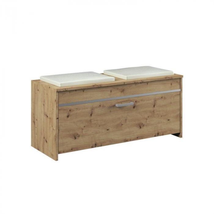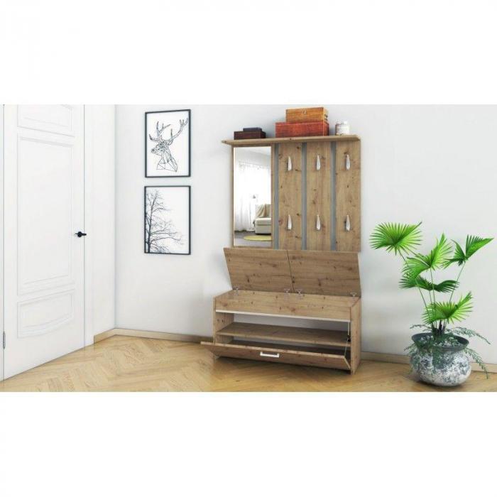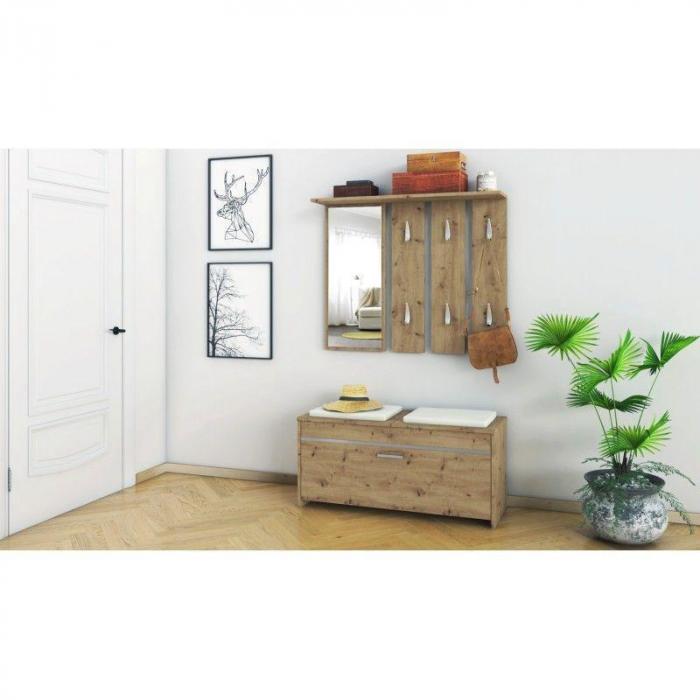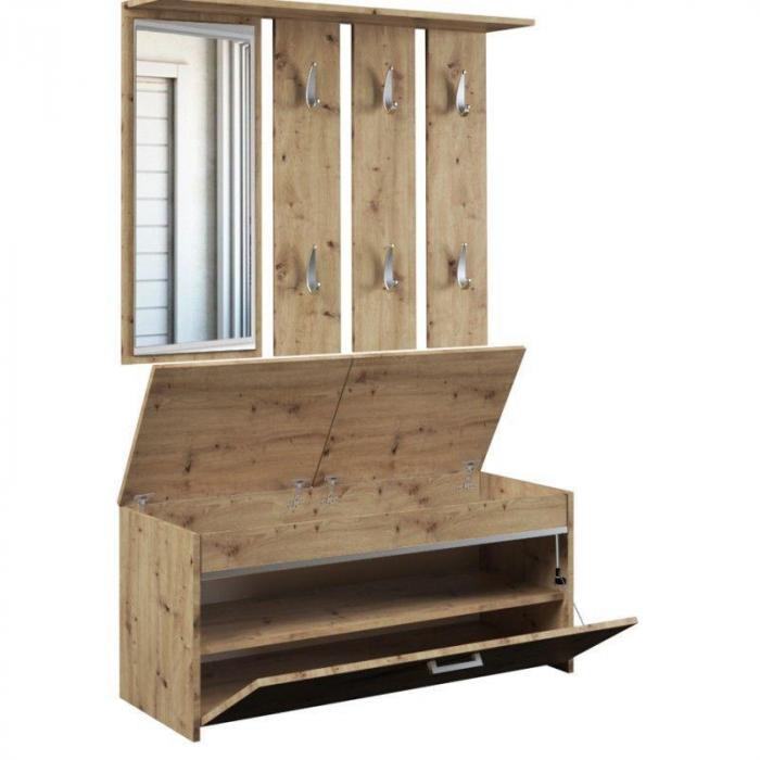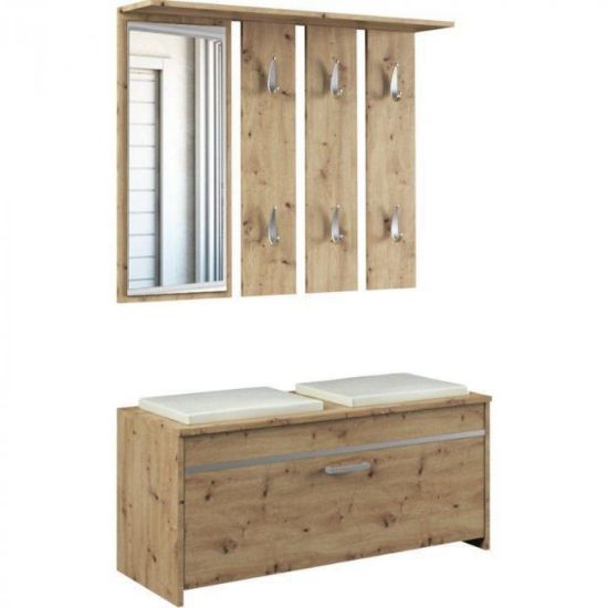Przedpokój Davos pozwoli szybko i wygodnie umeblować przedpokój. Na zestaw składa się moduł stojący, czyli zamykana szafka na buty ze schowkiem i siedziskiem, a także moduł wiszący – elegancki panel z sześcioma praktycznymi wieszakami oraz lustrem, pozwalającym skontrolować swój wygląd przed wyjściem z domu. Wszystko to zamknięto w wymiarach 100x38x160 cm. Na uwagę zasługuje fakt, że przedpokój Davos wykonany został z płyty laminowanej o grubości 18 mm co zapewnia jego wyjątkową wytrzymałość oraz solidność. Przedpokój w kolorze dąb aristan.