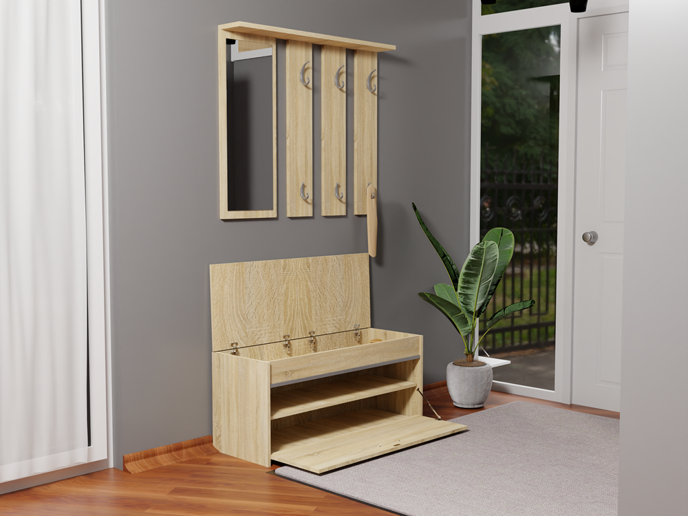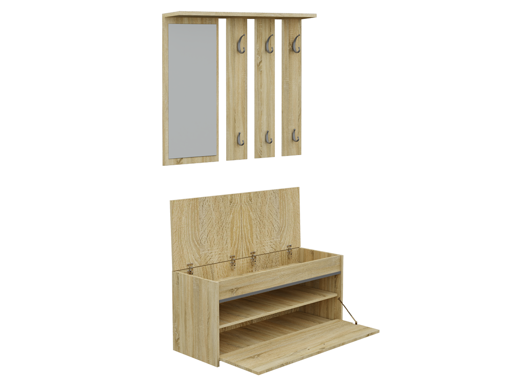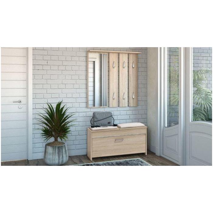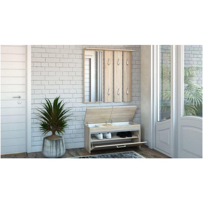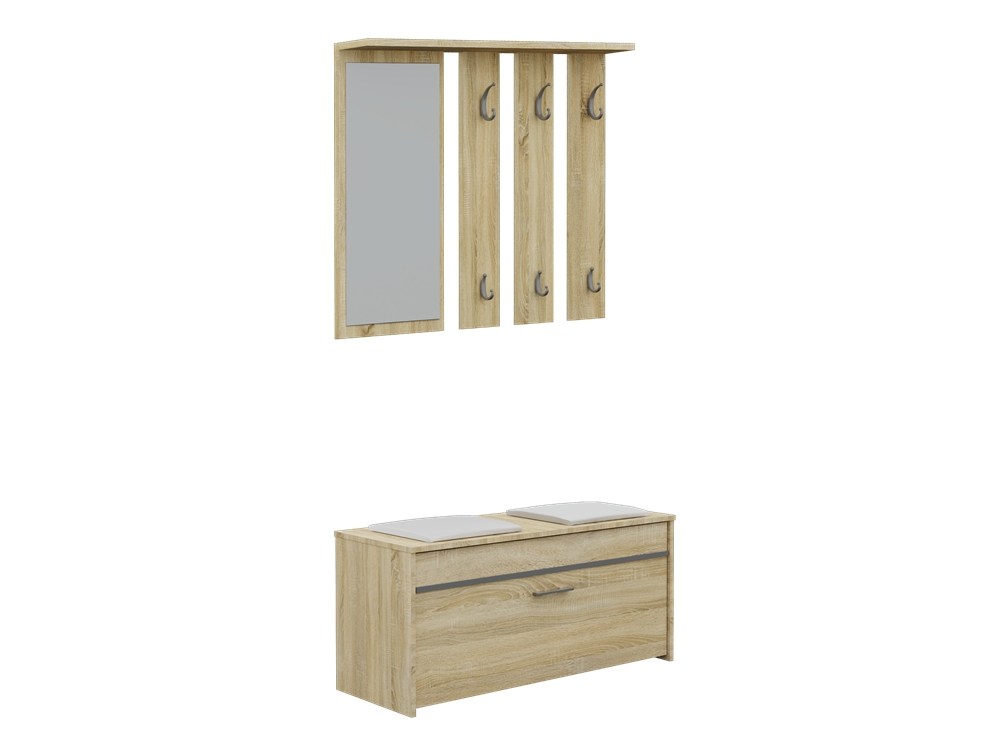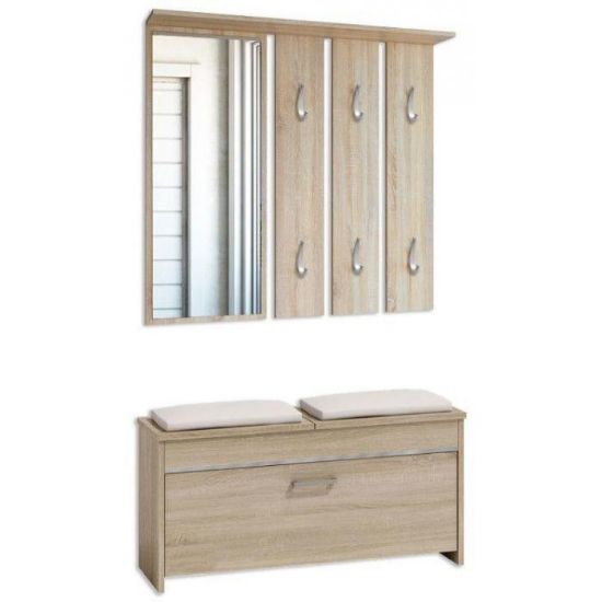 Przedpokój Davos pozwoli szybko i wygodnie umeblować przedpokój. Na zestaw składa się moduł stojący, czyli zamykana szafka na buty ze schowkiem i siedziskiem, a także moduł wiszący – elegancki panel z sześcioma praktycznymi wieszakami oraz lustrem, pozwalającym skontrolować swój wygląd przed wyjściem z domu. Wszystko to zamknięto w wymiarach 100x38x160 cm. Na uwagę zasługuje fakt, że przedpokój Davos wykonany został z płyty laminowanej o grubości 18 mm co zapewnia jego wyjątkową wytrzymałość oraz solidność. Przedpokój w kolorze dąb sonoma.