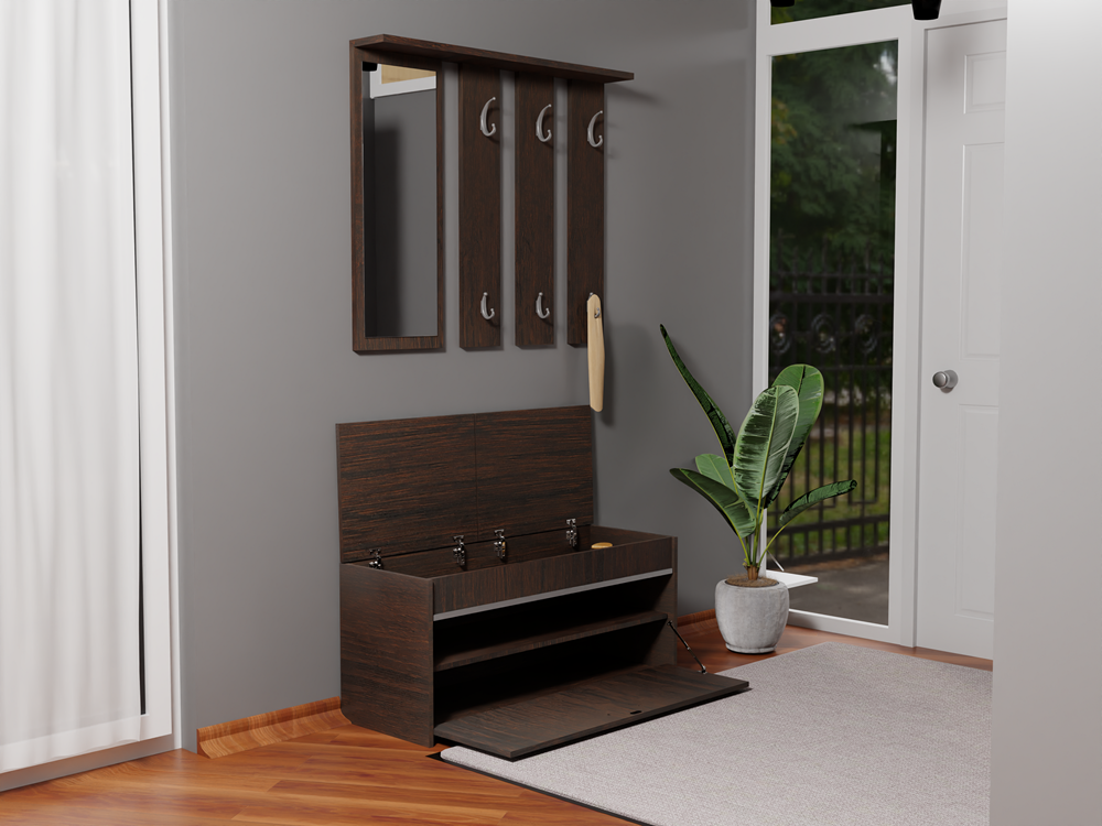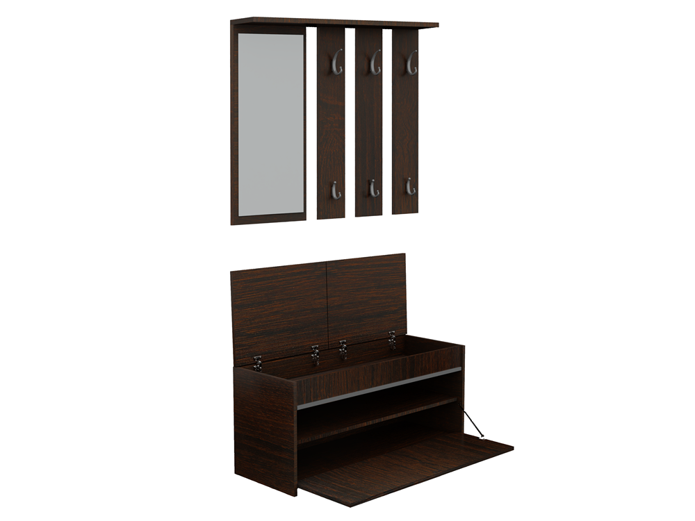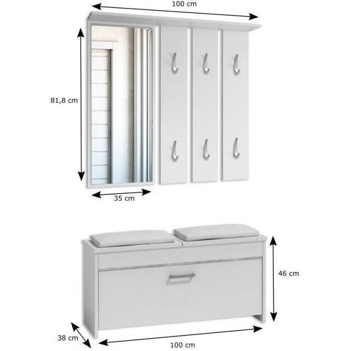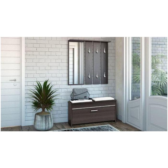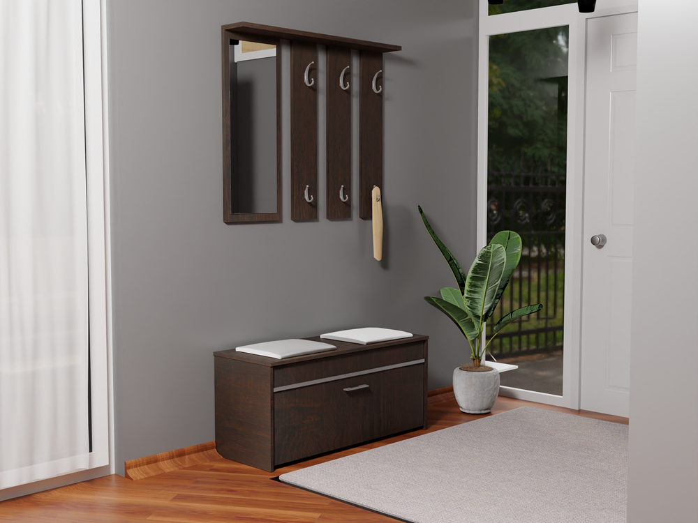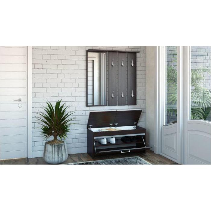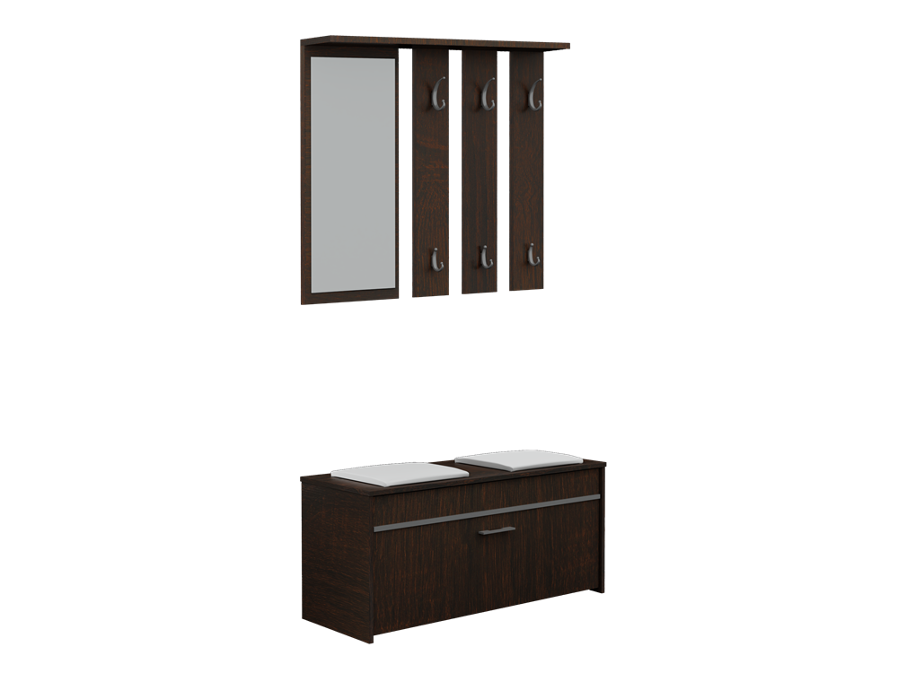 Przedpokój Davos pozwoli szybko i wygodnie umeblować przedpokój. Na zestaw składa się moduł stojący, czyli zamykana szafka na buty ze schowkiem i siedziskiem, a także moduł wiszący – elegancki panel z sześcioma praktycznymi wieszakami oraz lustrem, pozwalającym skontrolować swój wygląd przed wyjściem z domu. Wszystko to zamknięto w wymiarach 100x38x160 cm. Na uwagę zasługuje fakt, że przedpokój Davos wykonany został z płyty laminowanej o grubości 18 mm co zapewnia jego wyjątkową wytrzymałość oraz solidność. Przedpokój w kolorze wenge.