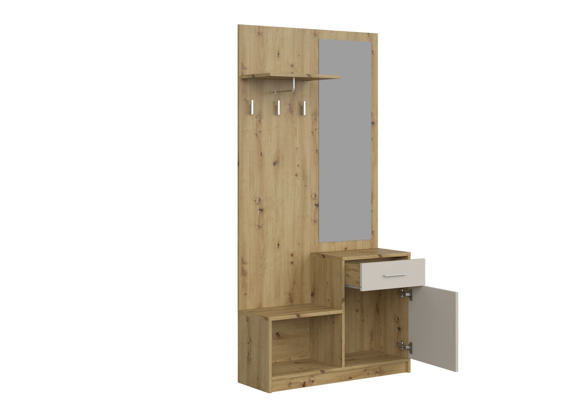 Przedpokój Frame dąb artisan/kaszmir to kompletne rozwiązanie, które łączy w sobie kilka funkcji w jednym meblu. Wieszak ułatwia organizację odzieży wierzchniej, szafka pozwala przechowywać obuwie i dodatki, a szafa z lustrem zapewnia dodatkową przestrzeń oraz estetyczne wykończenie wnętrza. Dzięki temu zestaw sprawdzi się zarówno w codziennym użytkowaniu, jak i w aranżacjach nastawionych na porządek i estetykę.