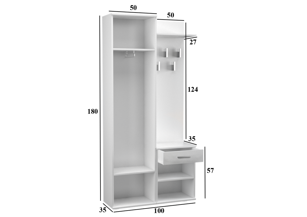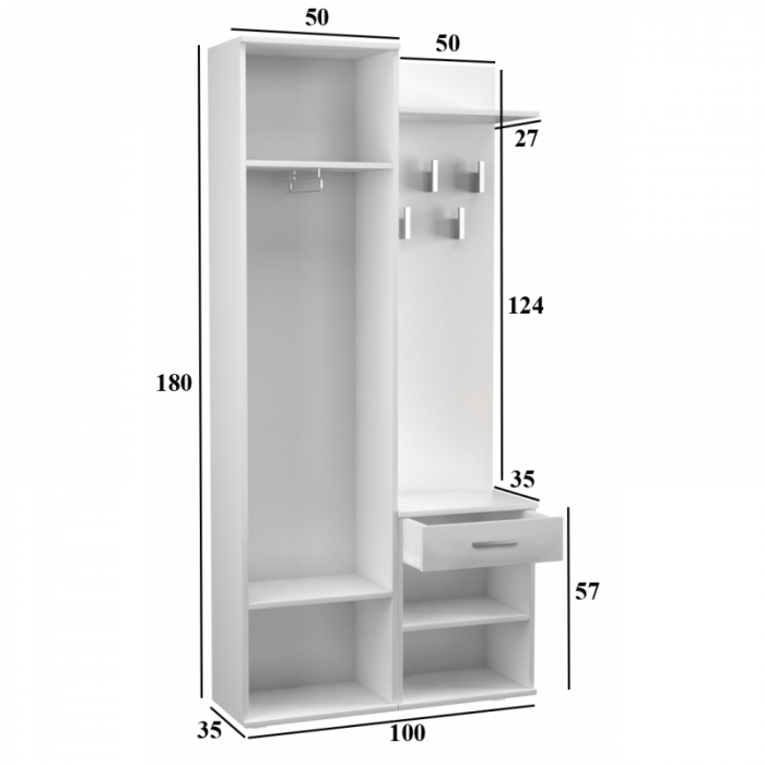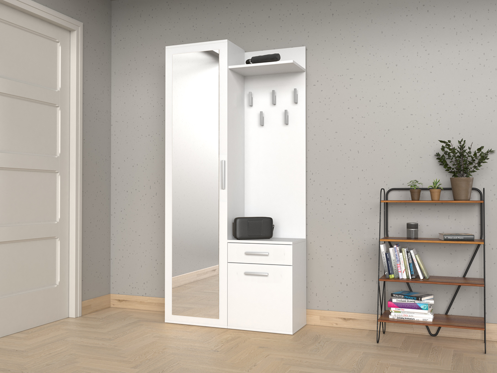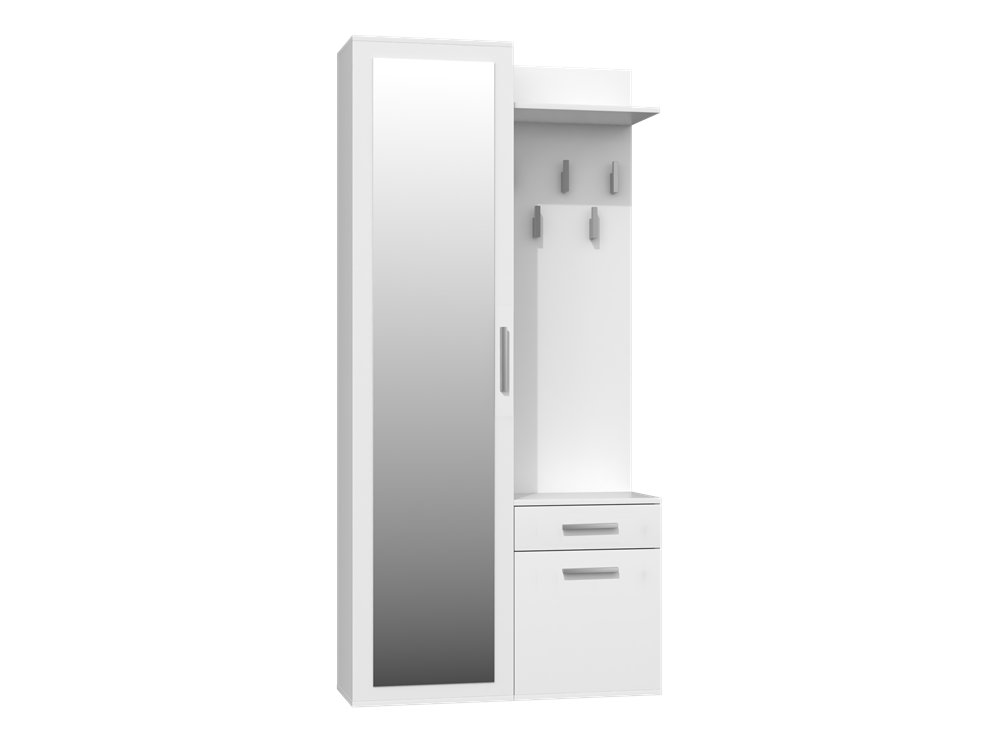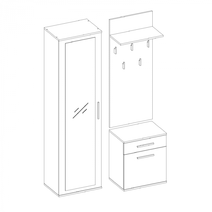 Dodatkowe informacje: - szafę z lustrem, szafkę oraz wieszak można zamontować blisko siebie lub rozsunąć, - możliwość montażu drzwi szafy na lewą lub prawą stronę WYMIARY SZAFY Z LUSTREM: Głębokość: 35 cm Szerokość: 50 cm Wysokość: 180 cm WYMIARY MNIEJSZEJ SZAFKI: Głębokość: 35 cm Szerokość: 50 cm Wysokość: 57 cm WYMIARY WIESZAKA Z PÓŁKĄ: Głębokość: 27 cm Szerokość: 50 cm Wysokość: 124 cm