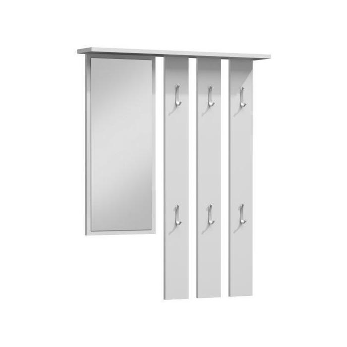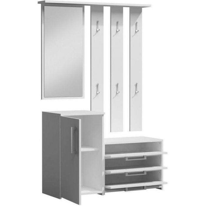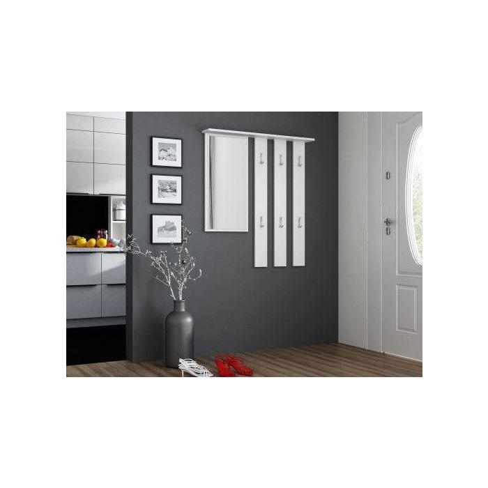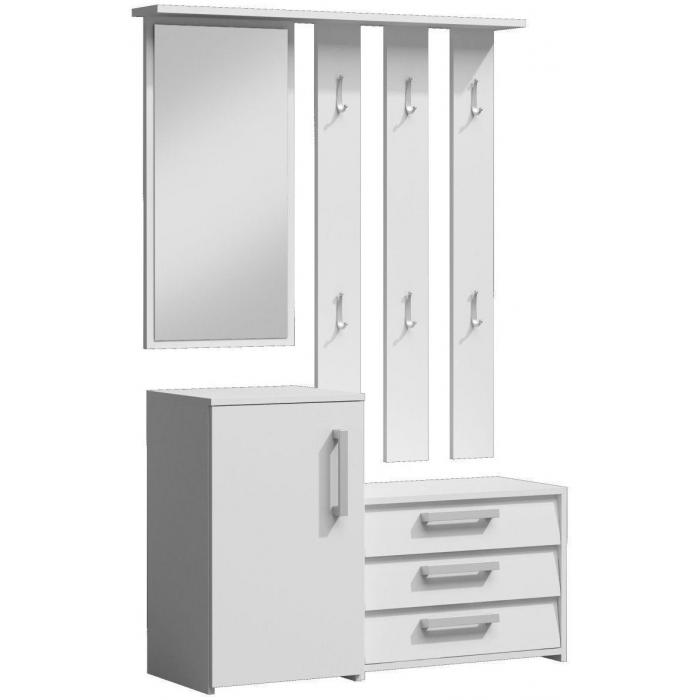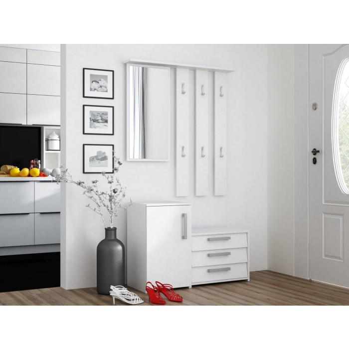 Przedpokój Orion to bardzo praktyczna i funkcjonalna garderoba. Na zestaw składa się moduł stojący, czyli zamykana szafka na buty z szufladami i półkami, a także moduł wiszący – funkcjonalny panel z sześcioma praktycznymi wieszakami oraz lustrem, pozwalającym skontrolować swój wygląd przed wyjściem z domu. Wszystko to zamknięto w wymiarach 99x36x180 cm. Przedpokój Orion wykonany został z płyty laminowanej o grubości 16 mm co zapewnia jego wytrzymałość oraz solidność. Przedpokój w kolorze białym.