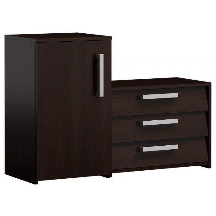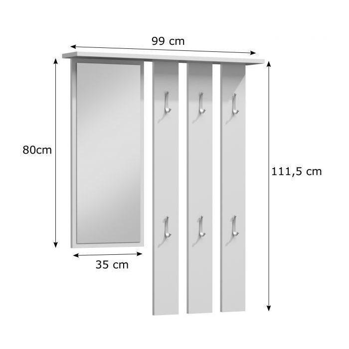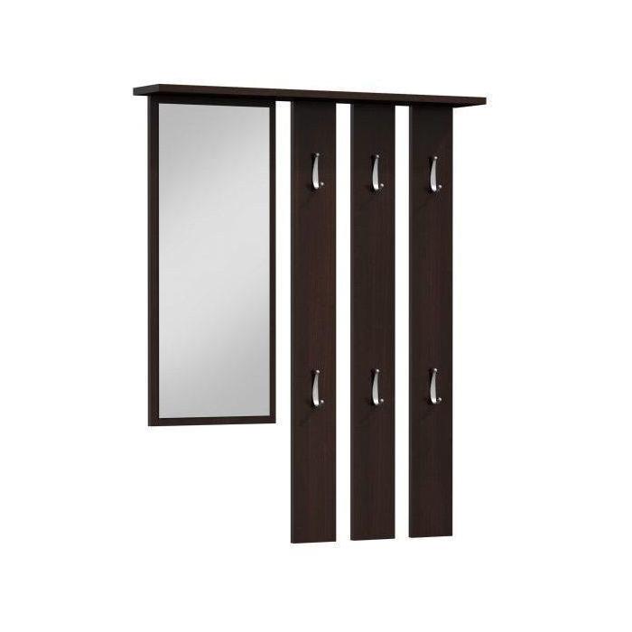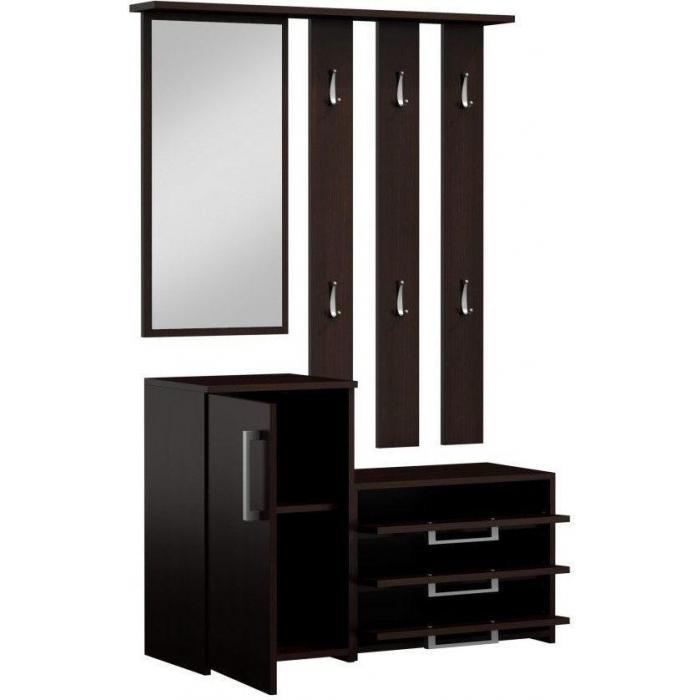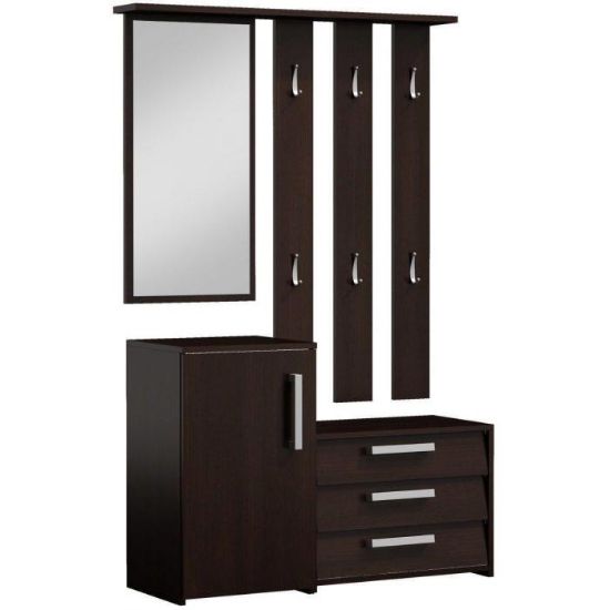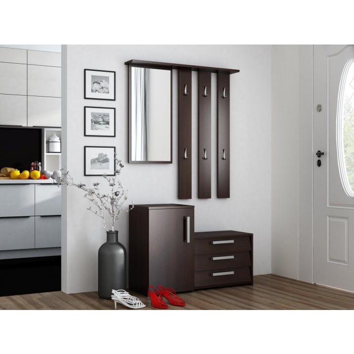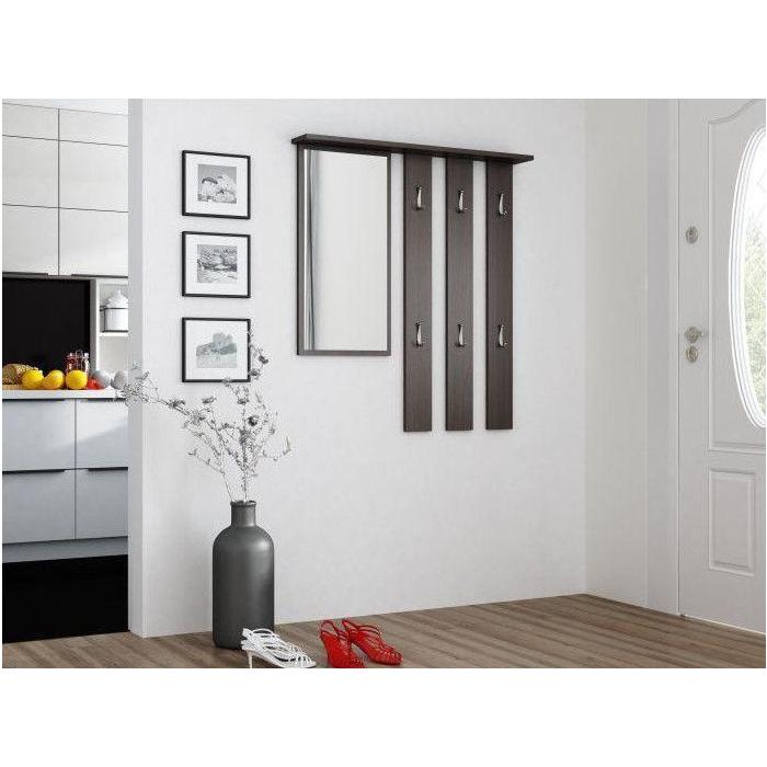 Przedpokój Orion to bardzo praktyczna i funkcjonalna garderoba. Na zestaw składa się moduł stojący, czyli zamykana szafka na buty z szufladami i półkami, a także moduł wiszący – funkcjonalny panel z sześcioma praktycznymi wieszakami oraz lustrem, pozwalającym skontrolować swój wygląd przed wyjściem z domu. Wszystko to zamknięto w wymiarach 99x36x180 cm. Przedpokój Orion wykonany został z płyty laminowanej o grubości 16 mm co zapewnia jego wytrzymałość oraz solidność. Przedpokój w kolorze wenge.