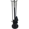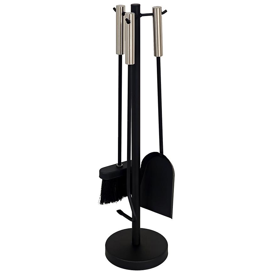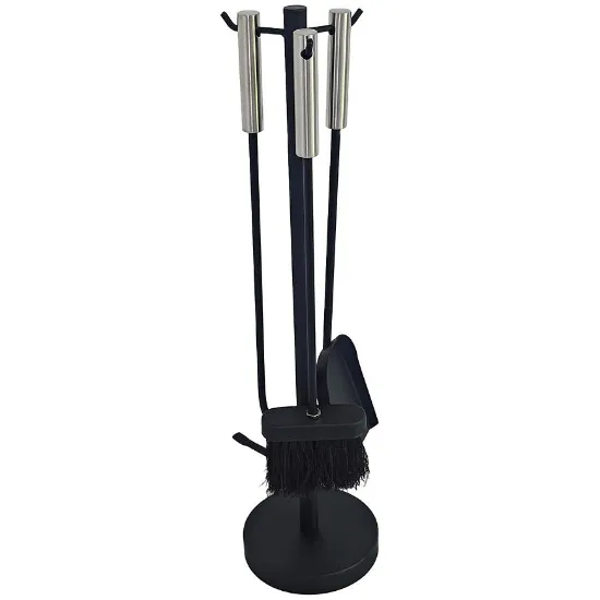 Inspiracje Zestaw z czterch elementów: stojak, szufelka, miotełka, hak (pogrzebacz). Wykonany ze stali.