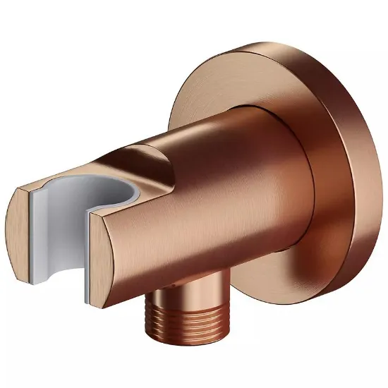 Przyłącze kątowe z uchwytem na rączkę prysznicową to funkcjonalny i estetyczny element armatury łazienkowej, wykonany z wysokiej jakości mosiądzu, który zapewnia trwałość i odporność na korozję. Wyposażone w praktyczną rozetę o średnicy 6 cm i odległość od ściany 7 cm, doskonale sprawdza się w nowoczesnych aranżacjach. Dodatkowa wkładka ochronna gwarantuje bezpieczne i stabilne mocowanie słuchawki natryskowej. To idealne rozwiązanie dla osób ceniących wygodę i solidne wykonanie w strefie prysznicowej.