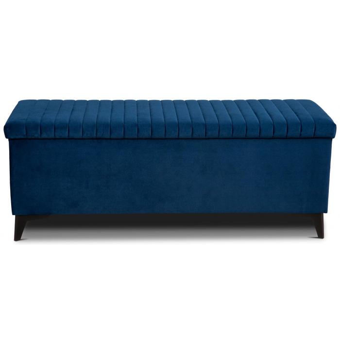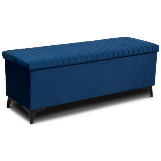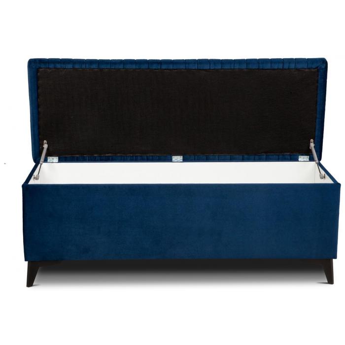 Pufa otwierana, tapicerowana tkaniną Kronos 6 w kolorze granatowym. Pufa Diuna posiada zamykany schowek. Całość osadzona na wysokich nóżkach wykonanych z tworzywa w kolorze czarnym.