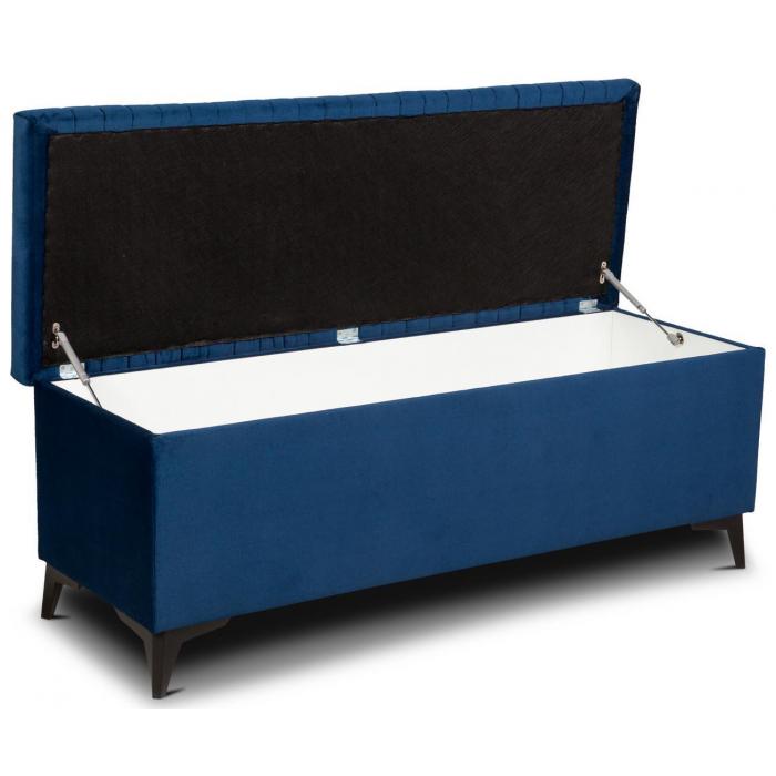 Pufa otwierana, tapicerowana tkaniną Kronos 6 w kolorze granatowym. Pufa Diuna posiada zamykany schowek. Całość osadzona na wysokich nóżkach wykonanych z tworzywa w kolorze czarnym.