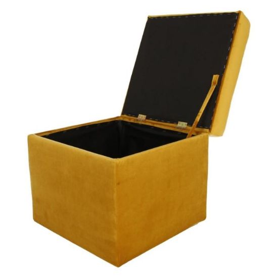 Pufa otwierana o wymiarach 45x45xx44 cm. Posiada praktyczny schowek na koce lub poduszki. Sprawdzi się jako dodatkowe miejsce do siedzenia lub podnóżek. Wykonana w tkaninie Velutto 8 w kolorze musztardowym. Na siedzisku pufa posiada ozdobne pikowanie.