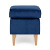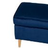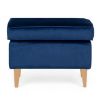 Naturalna kolorystyka drewna w połączeniu z głębokim granatem tapicerki tworzy harmonijną całość. Taka pufa do salonu lub sypialni może pełnić rolę dodatkowego siedziska, podnóżka albo eleganckiego dodatku dekoracyjnego, który uzupełnia styl wnętrza.