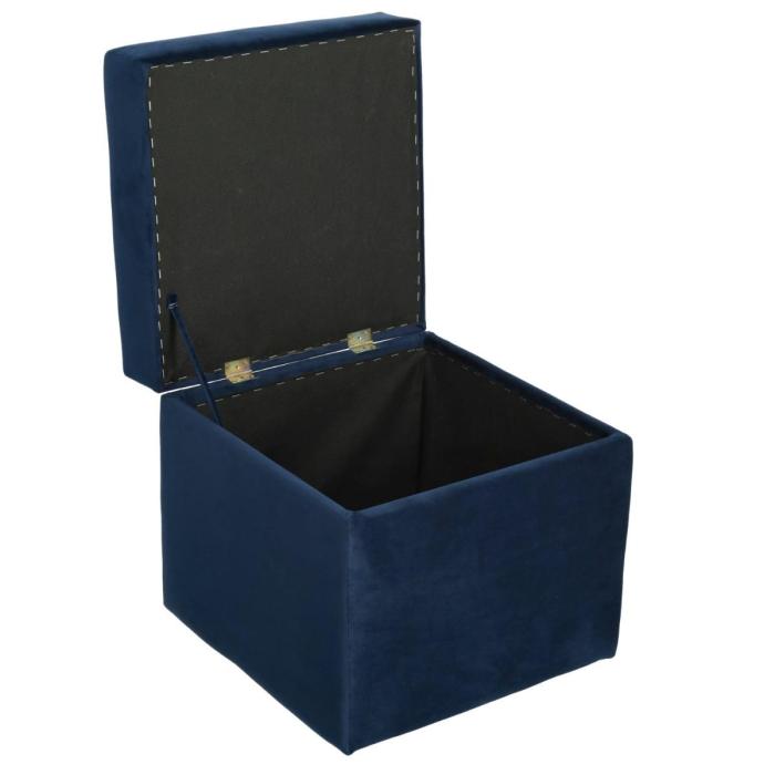 Pufa otwierana o wymiarach 45x45xx44 cm. Posiada praktyczny schowek na koce lub poduszki. Sprawdzi się jako dodatkowe miejsce do siedzenia lub podnóżek. Wykonana w tkaninie Velutto 25 w kolorze granatowym. Na siedzisku pufa posiada ozdobne pikowanie.