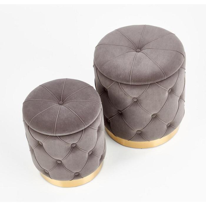 Pufy Polly - zestaw 2 puf. Wykonane z tkaniny welurowej z nóżką ze stali chromowanej w kolorze złotym. Jako element dekoracyjny zostały zastosowane ozdobne pikowania. Pufy są otwierane, można chować jedną w drugą.