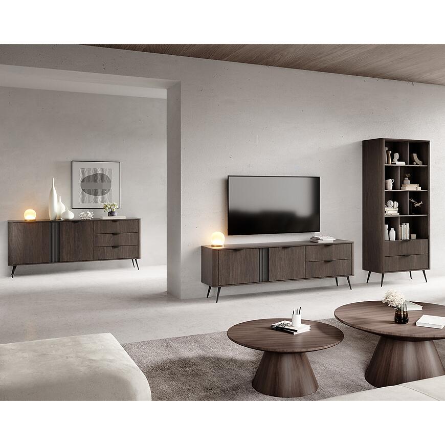 Korpus oraz fronty regału Veris A zostały wykonane z laminowanej płyty wiórowej, co przekłada się na trwałość i odporność na codzienne użytkowanie. Matowe wykończenie frontów i korpusu podkreśla nowoczesny styl mebla oraz sprawia, że powierzchnia jest łatwa w pielęgnacji. Kolor korpusu w odcieniu dąb dunin pozwala na łatwe dopasowanie regału do innych mebli z kolekcji VERIS lub do istniejącej zabudowy.