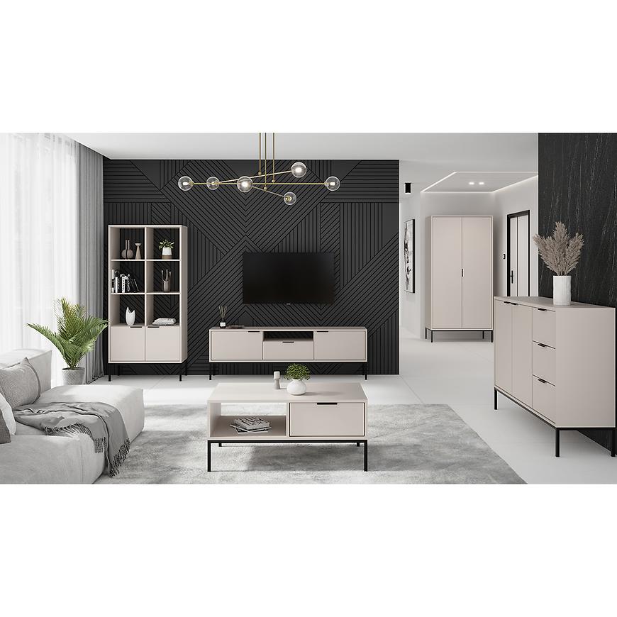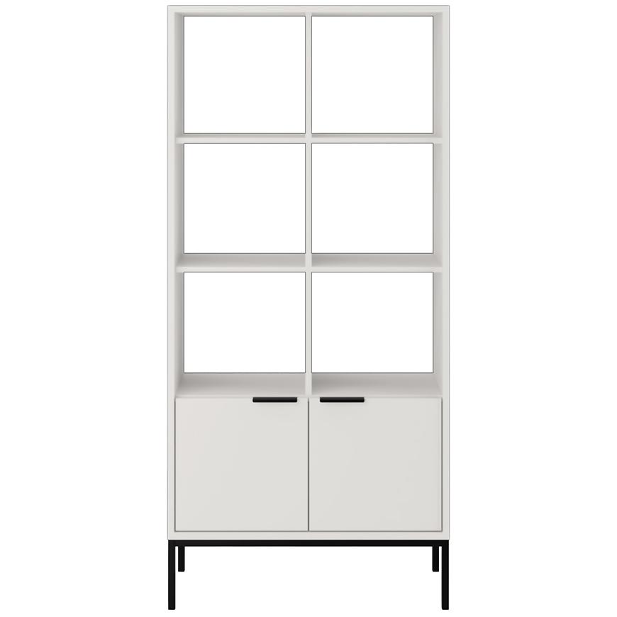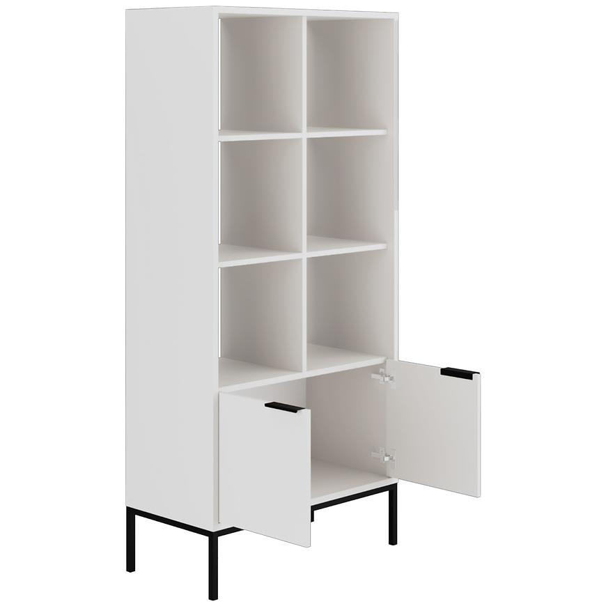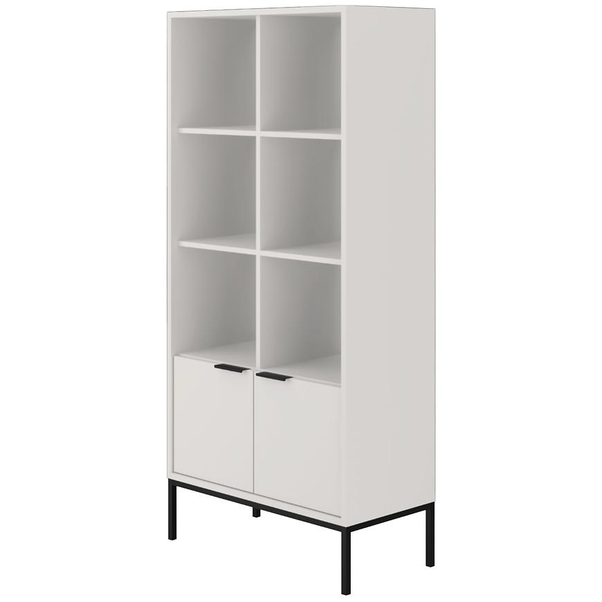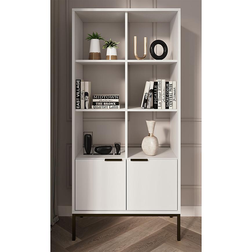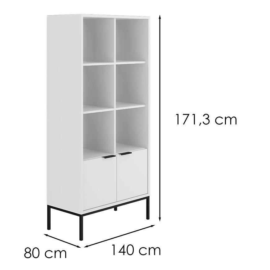 Regał Austin biały/czarny to stylowy i funkcjonalny mebel o nowoczesnym charakterze idealny do salonu. Wykonany z trwałej płyty wiórowej laminowanej, wykończony matowo w odcieniu klasycznej bieli z kontrastującymi czarnymi detalami. Regał ma 80 cm szerokości, 171,3 cm wysokości i 140 cm głębokości, oferując dużo miejsca do przechowywania książek, dekoracji czy dokumentów. Dwudrzwiowa konstrukcja pozwala na estetyczne ukrycie części zawartości. Mebel należy do kolekcji AUSTIN i wymaga samodzielnego montażu.
