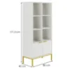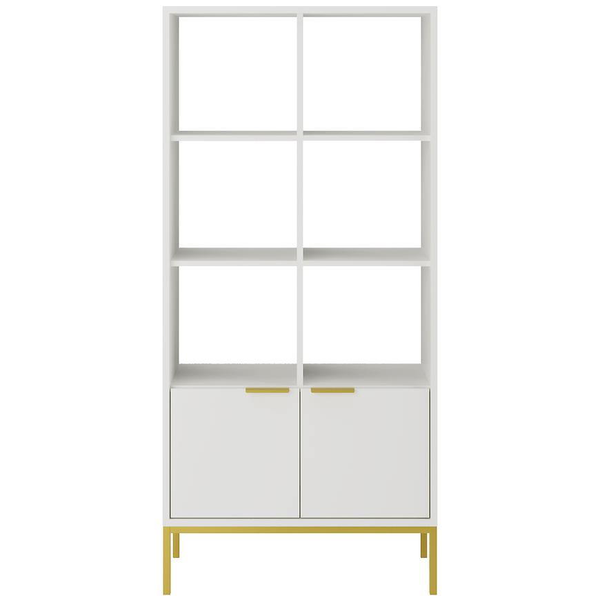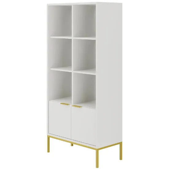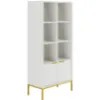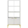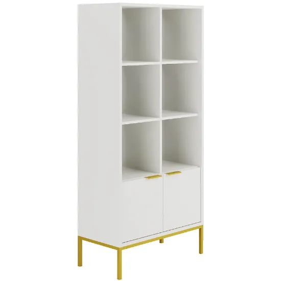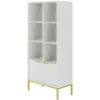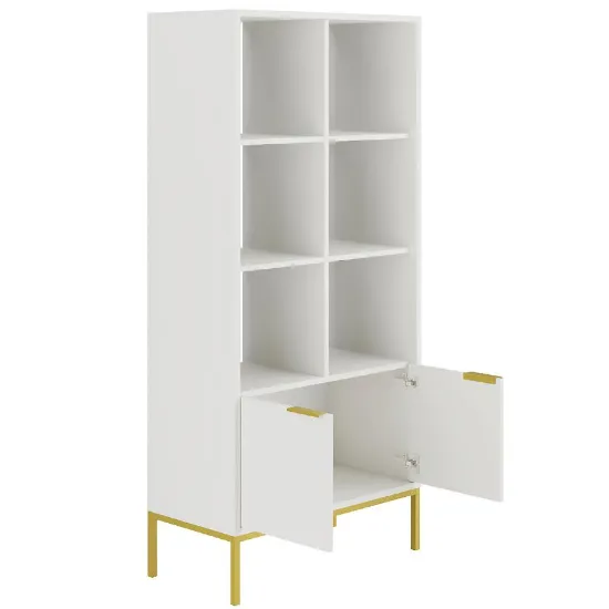 Regał Austin w kolorze Biały/Złoty to stylowy i funkcjonalny mebel, który doskonale wpasuje się w nowoczesne wnętrza. Jego elegancki design łączy minimalistyczne matowe wykończenie z praktycznym układem przestrzeni, oferując zarówno zamknięte, jak i otwarte miejsce do przechowywania. Wykonany z trwałej płyty wiórowej laminowanej, cechuje się odpornością na codzienne użytkowanie, zapewniając długą żywotność i łatwość w utrzymaniu czystości.