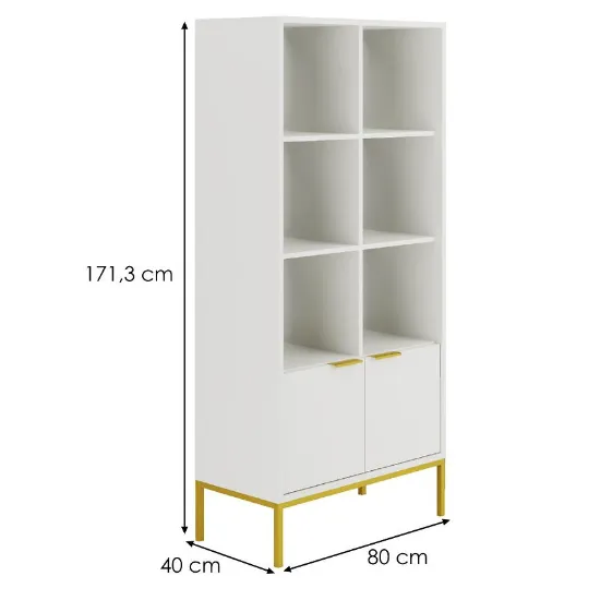 Szerokość 80 cm i wysokość 171,3 cm sprawiają, że regał jest pojemny, a jednocześnie nie przytłacza wnętrza. Dwudrzwiowa konstrukcja pozwala na estetyczne przechowywanie przedmiotów, ukrywając je przed wzrokiem, podczas gdy otwarte półki doskonale eksponują książki, dekoracje czy pamiątki. Nowoczesny styl regału podkreśla jego uniwersalny charakter, który sprawdzi się zarówno w salonie, biurze, jak i pokoju młodzieżowym.