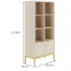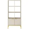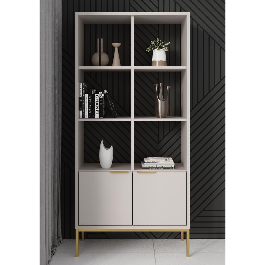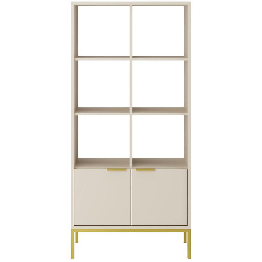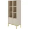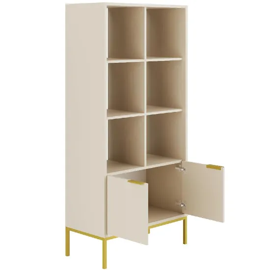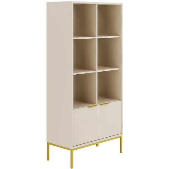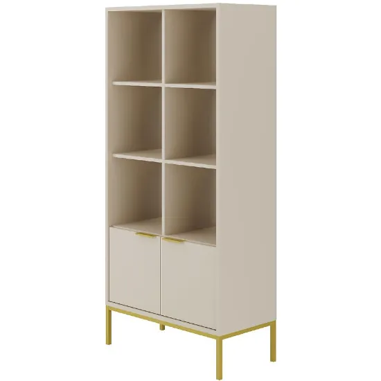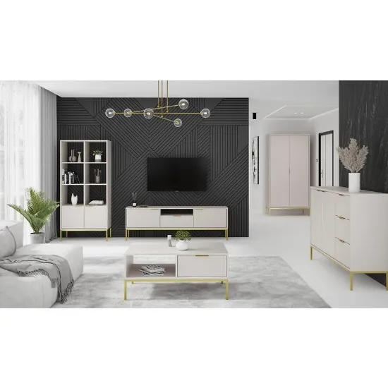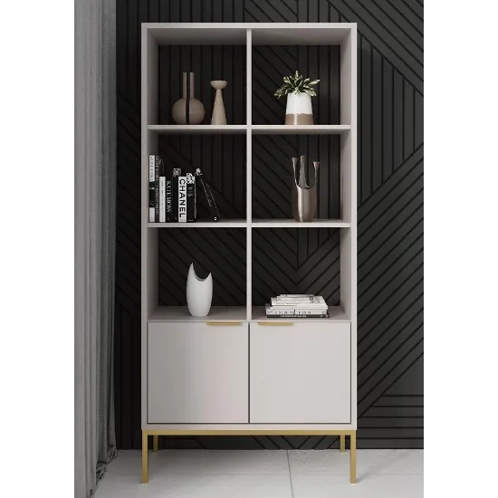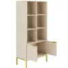 Regał Austin w kolorze Kaszmir/Złoty to stylowy i funkcjonalny mebel, który doskonale wpasuje się w nowoczesne wnętrza. Jego elegancki design łączy minimalistyczne matowe wykończenie z praktycznym układem przestrzeni, oferując zarówno zamknięte, jak i otwarte miejsce do przechowywania. Wykonany z trwałej płyty wiórowej laminowanej, cechuje się odpornością na codzienne użytkowanie, zapewniając długą żywotność i łatwość w utrzymaniu czystości.