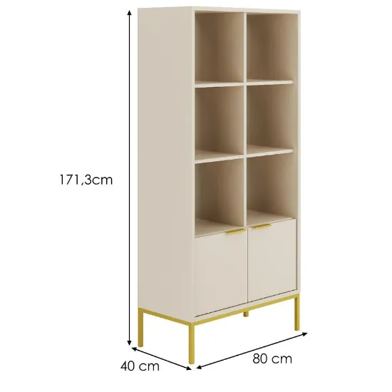 Szerokość 80 cm i wysokość 171,3 cm sprawiają, że regał jest pojemny, a jednocześnie nie przytłacza wnętrza. Dwudrzwiowa konstrukcja pozwala na estetyczne przechowywanie przedmiotów, ukrywając je przed wzrokiem, podczas gdy otwarte półki doskonale eksponują książki, dekoracje czy pamiątki. Nowoczesny styl regału podkreśla jego uniwersalny charakter, który sprawdzi się zarówno w salonie, biurze, jak i pokoju młodzieżowym.