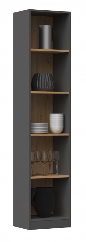 Regał Basic 40 to klasyczny regał, który sprawdzi się nie tylko do biura czy pokoju młodzieżowego ale także do innych pomieszczeń. Regal Basic 40 można przeznaczyć na książki, segregatory, zabawki oraz inne dowolne przedmioty. Na uwagę zasługuje fakt, że regał Basic wykonany został z płyty laminowanej, obrzeża zostały wykończone tworzywem PCV co zapewnia wyjątkową wytrzymałość oraz solidność. Regał w kolorze antracyt/dąb artisan. Odległość między półkami wynosi 33 cm.