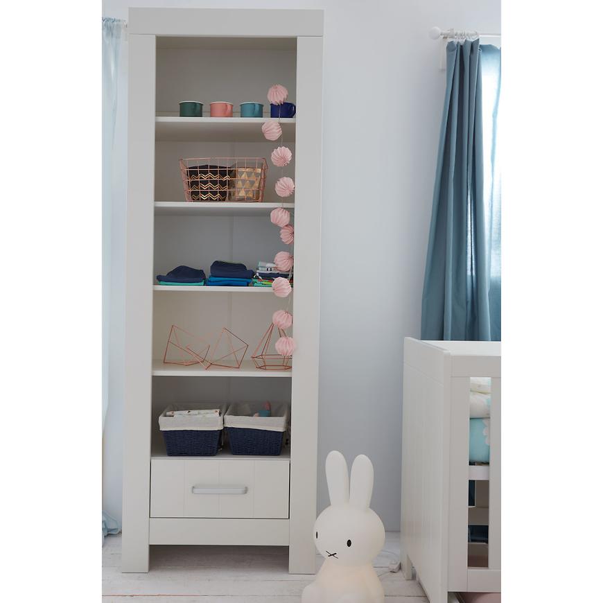 Ten otwarty regał został wyposażony w cztery przestronne półki, które oferują dużo miejsca na książki, zabawki, dekoracje czy inne dziecięce skarby. Dodatkowa szuflada na dole regału pozwala na schowanie mniejszych przedmiotów, co sprzyja utrzymaniu porządku i organizacji. Szczególnie funkcjonalne są wysokiej jakości prowadnice z hamulcem i samodomykiem, które zapewniają ciche i bezpieczne użytkowanie.