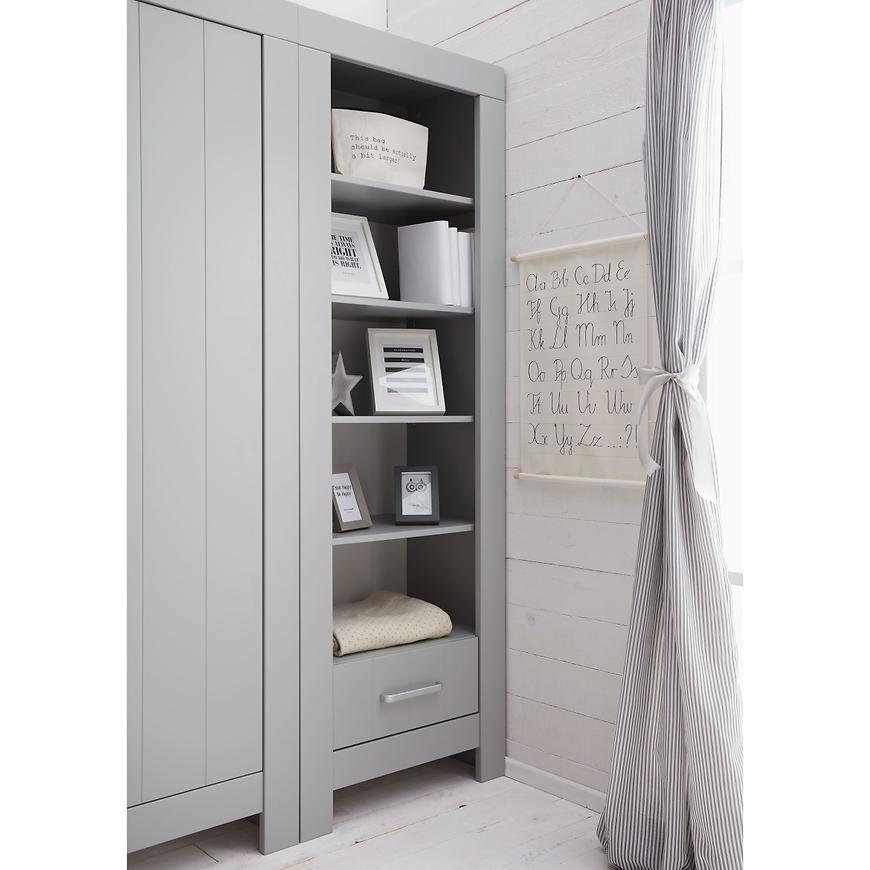 Ten otwarty regał został wyposażony w cztery przestronne półki, które oferują dużo miejsca na książki, zabawki, dekoracje czy inne dziecięce skarby. Dodatkowa szuflada na dole regału pozwala na schowanie mniejszych przedmiotów, co sprzyja utrzymaniu porządku i organizacji. Szczególnie funkcjonalne są wysokiej jakości prowadnice z hamulcem i samodomykiem, które zapewniają ciche i bezpieczne użytkowanie.