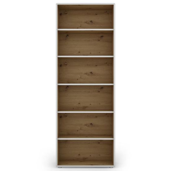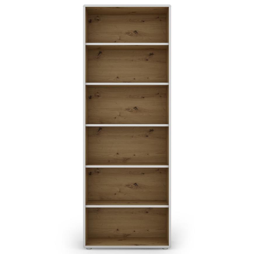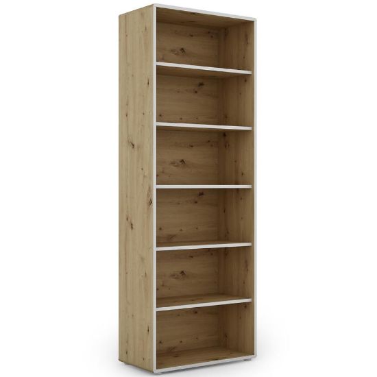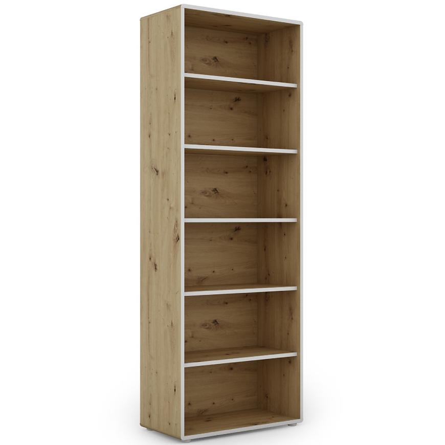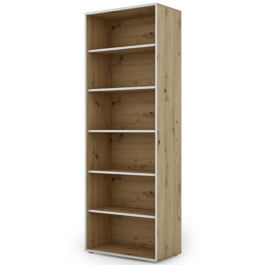 Kolor dąb artisan z białymi elementami tworzy harmonijną kompozycję, która pasuje do różnorodnych aranżacji. Matowe wykończenie podkreśla nowoczesny charakter regału, a konstrukcja oparta na płycie wiórowej laminowanej gwarantuje trwałość i solidność mebla.