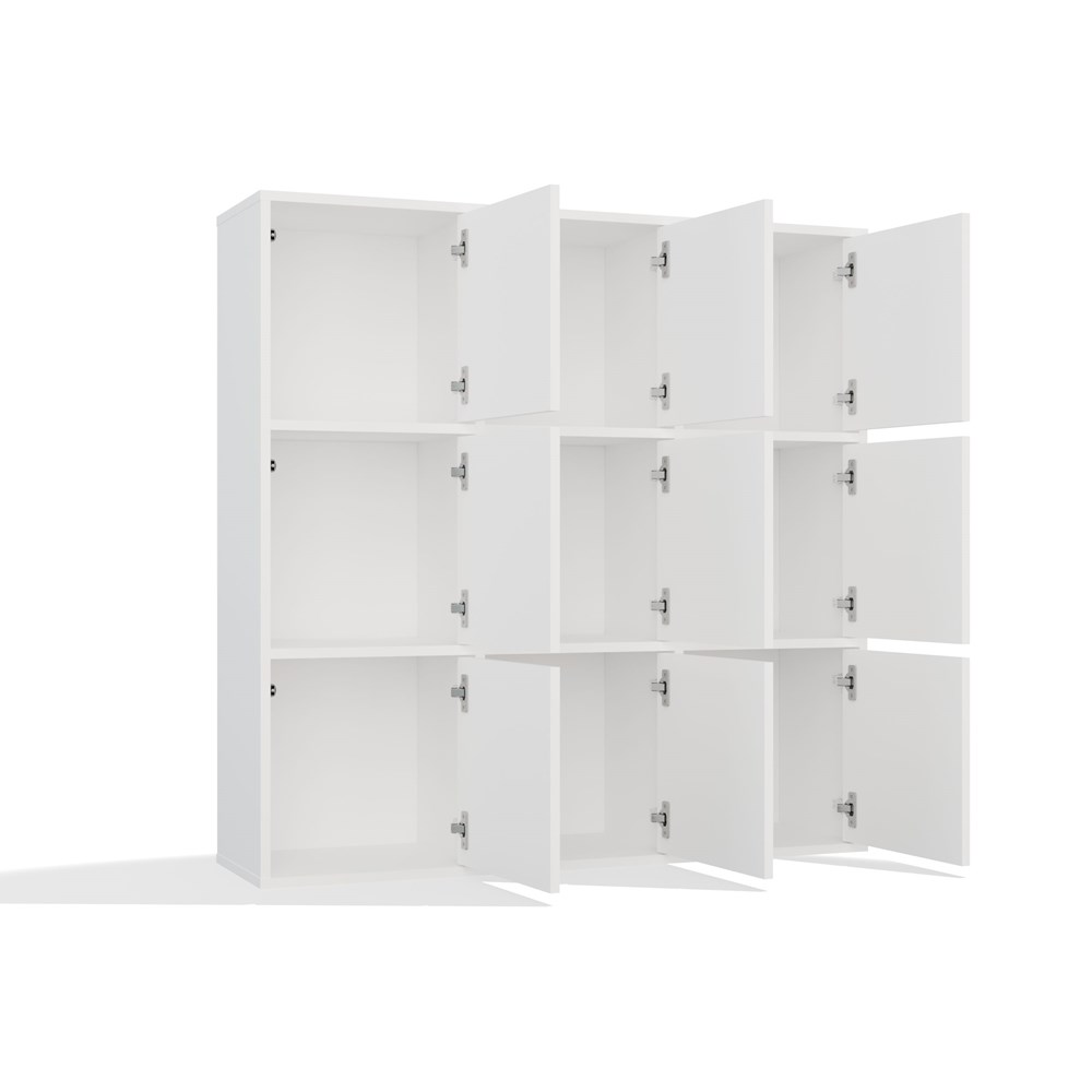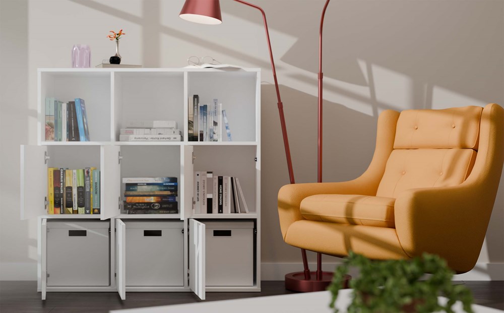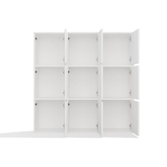 Regał jest wyposażony w 9 równych komór, doskonałych do przechowywania książek, dokumentów, zabawek oraz dekoracji. Drzwiczki z systemem TIP-ON otwierają się po lekkim naciśnięciu, zapewniając wygodę użytkowania. Zabudowany tył z pełnej płyty HDF nie tylko wzmacnia konstrukcję, ale również dodaje regałowi eleganckiego wyglądu, umożliwiając jego ustawienie jako wolnostojący mebel.