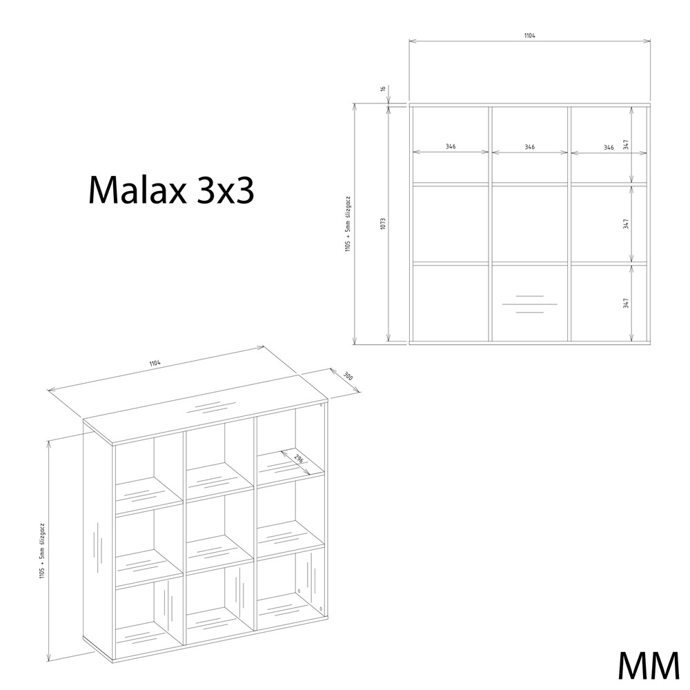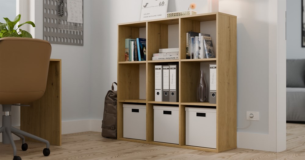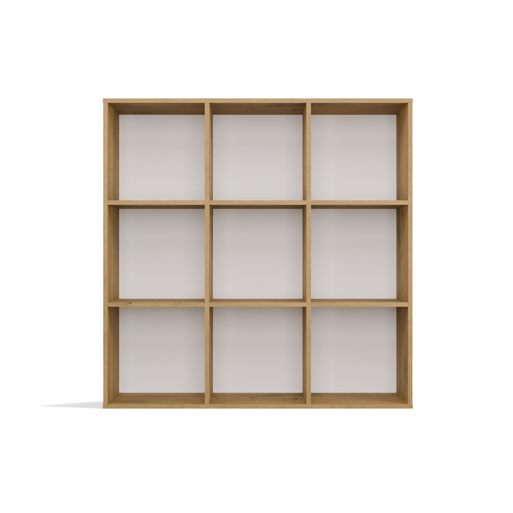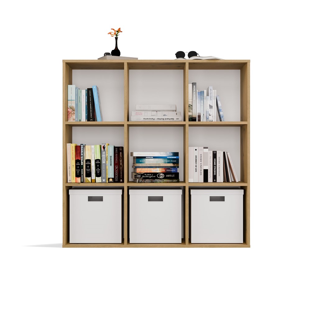 Wykonany z laminowanej płyty wiórowej o grubości 16 mm, tył: płyta HDF (pełne zabudowanie) regał Carl cechuje się trwałością, łatwością w utrzymaniu czystości oraz nowoczesnym wyglądem. Jego komorowa konstrukcja typu 3x3, wymiary komory: 34,5 cm x 34,5 cm sprawia, że mebel sprawdzi się zarówno jako regał na książki, jak i miejsce do przechowywania dekoracji, dokumentów czy akcesoriów domowych.