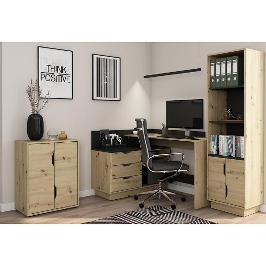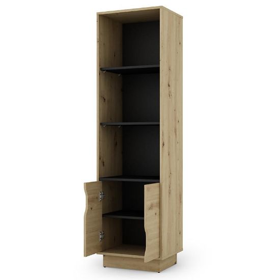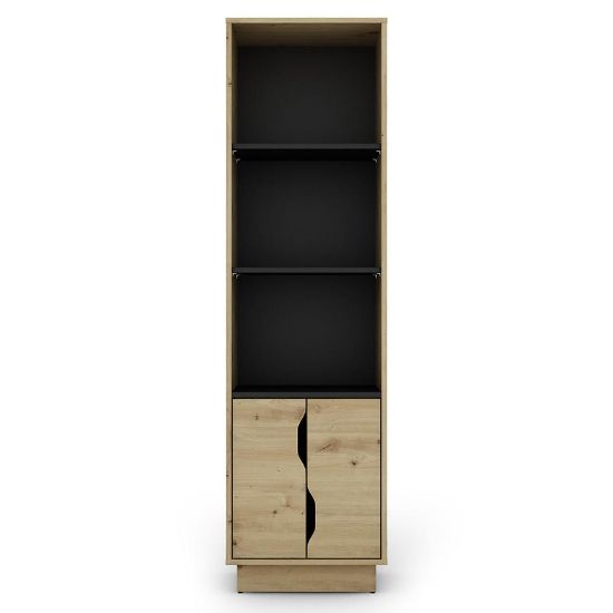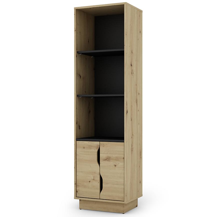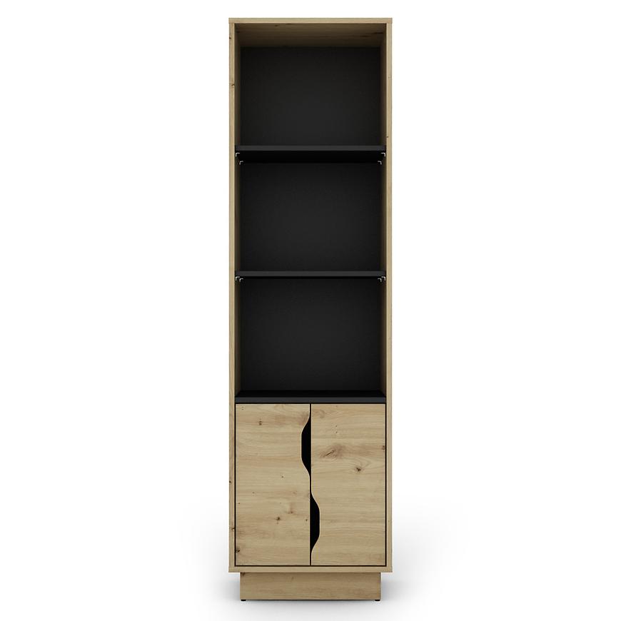 Regał Cesar 2 to elegancki mebel, który łączy nowoczesny design z funkcjonalnością, idealnie wpisując się w potrzeby współczesnych wnętrz. Wykonany z wytrzymałej płyty wiórowej laminowanej, regał zapewnia trwałość i odporność na codzienne użytkowanie. Matowe wykończenie dodaje mu subtelnej elegancji, a naturalny kolor artisan na froncie i korpusie, połączony z kontrastującymi czarnymi elementami, nadaje wnętrzu wyjątkowego charakteru.