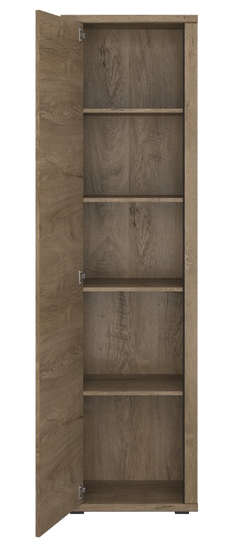 Jednodrzwiowy design regału Cordan to nie tylko estetyczny element, ale także praktyczne rozwiązanie. Drzwi uchylne pozwalają na łatwy dostęp do przechowywanych przedmiotów, jednocześnie ukrywając je przed wzrokiem, co tworzy uporządkowany wygląd pomieszczenia. Wnętrze regału skrywa cztery solidne półki, które zapewniają mnóstwo miejsca na książki, dekoracje czy inne przedmioty, które chcesz mieć na wyciągnięcie ręki.