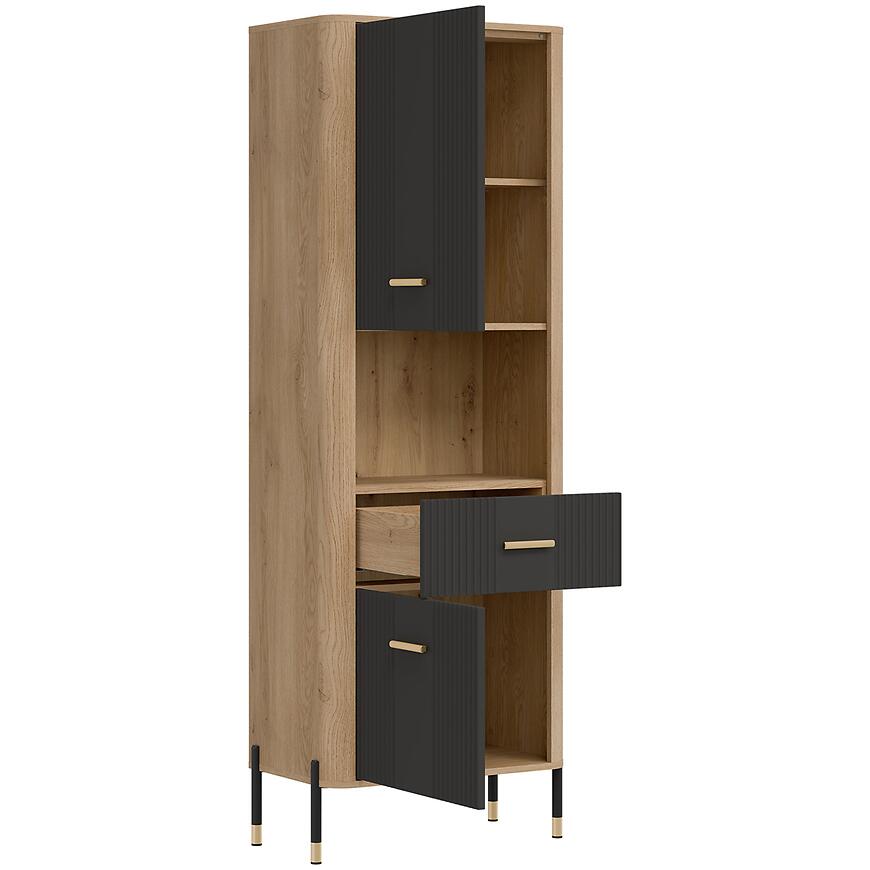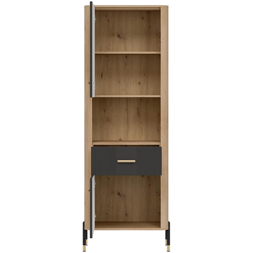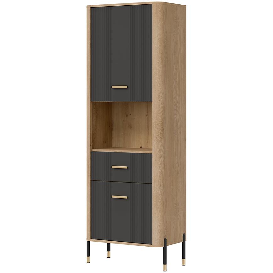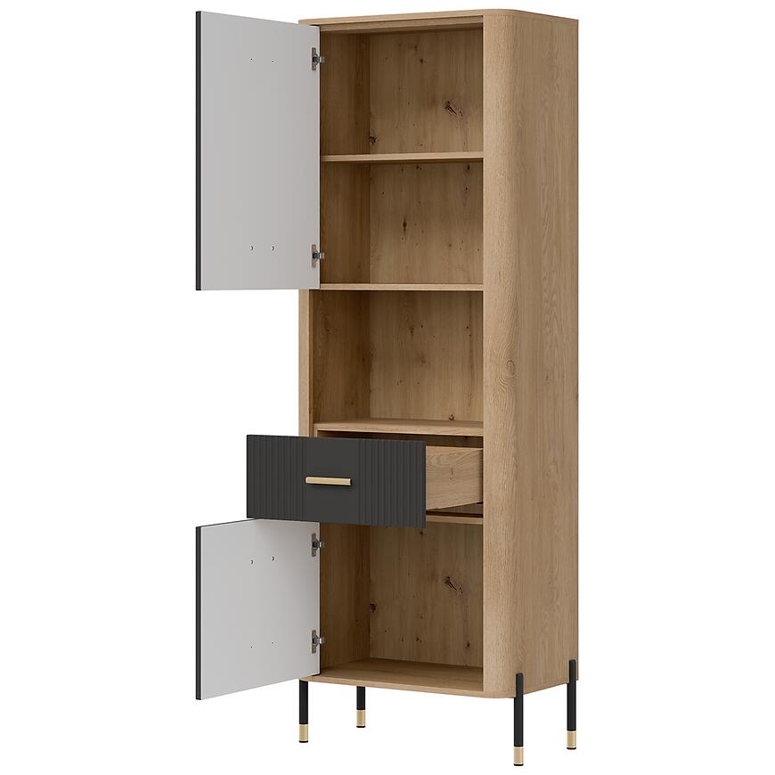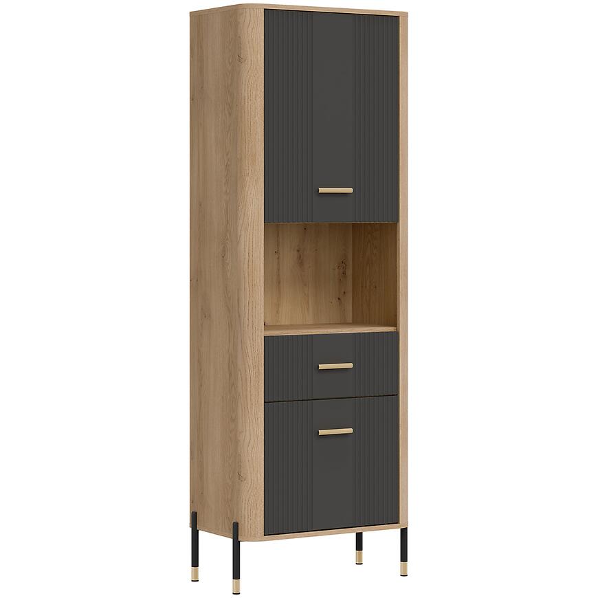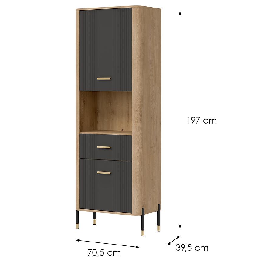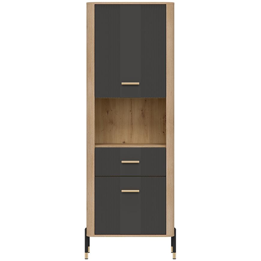 Antracytowe fronty w matowym wykończeniu nadają regałowi nowoczesny charakter, który harmonizuje z korpusem w kolorze dąb cremona. Połączenie kolorów sprawia, że mebel łatwo komponuje się z innymi meblami z kolekcji DANTE oraz dodatkami w neutralnych i naturalnych tonacjach.