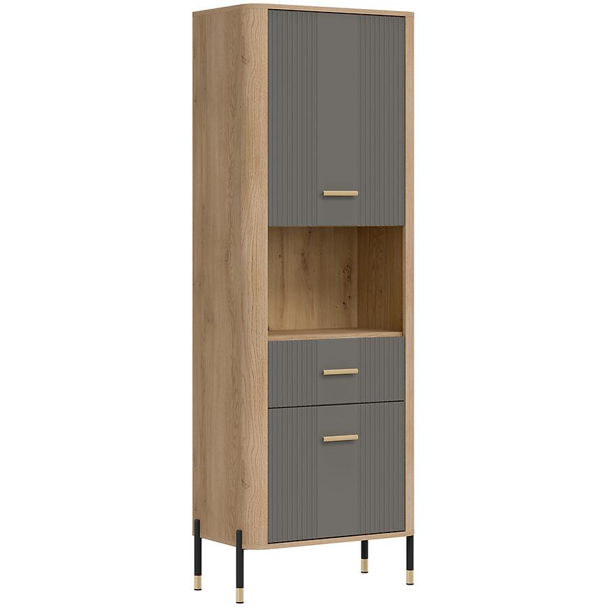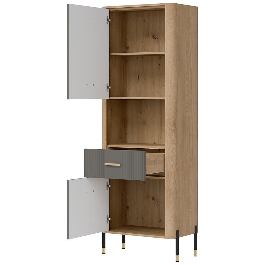 Regał Dante L/P DT15 w kolorze dąb cremona z szarymi frontami to funkcjonalny mebel łączący nowoczesny design z elegancją. Stonowany szary kolor frontów w połączeniu z naturalnym odcieniem drewna wprowadza do wnętrza harmonię i uporządkowany charakter, a matowe wykończenie frontów oraz korpusu podkreśla minimalistyczną, stylową formę regału.