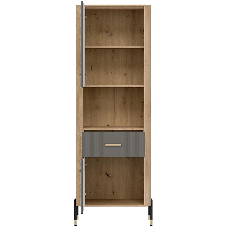 Regał Dante L/P DT15 dąb cremona szary to nowoczesny i funkcjonalny mebel, który łączy elegancki design z praktycznym układem przechowywania, idealny do salonu, biura lub gabinetu, tworząc uporządkowaną i stylową przestrzeń.