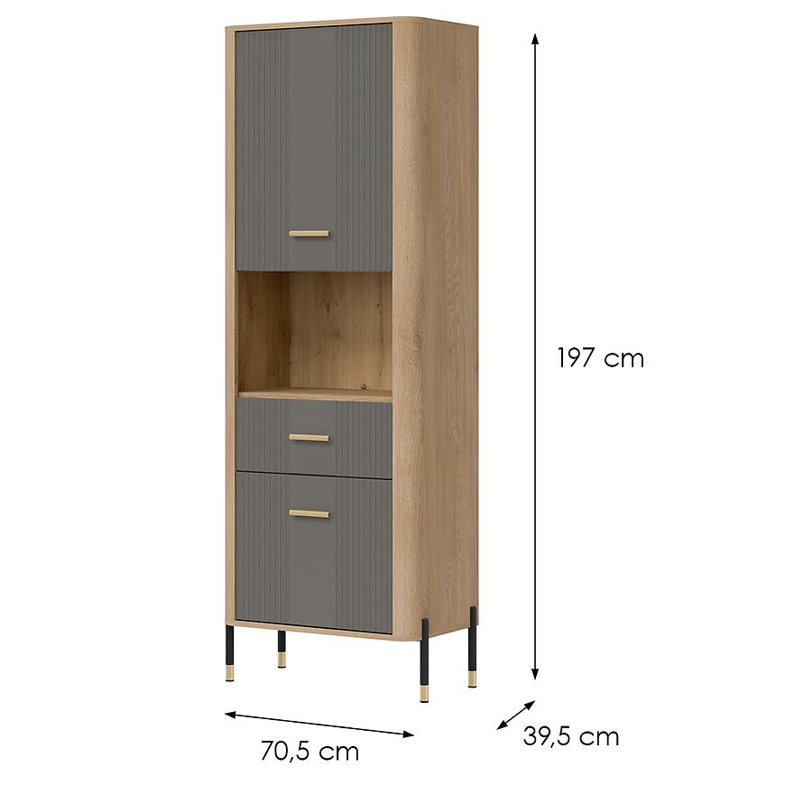 Wysokość 197 cm, szerokość 70,5 cm i głębokość 39,5 cm zapewniają przestronną powierzchnię do przechowywania książek, dokumentów czy dekoracji. Dwudrzwiowa konstrukcja umożliwia wygodny dostęp do wnętrza, a prosty, nowoczesny kształt regału pozwala dopasować go do różnych aranżacji salonu, biura lub gabinetu.